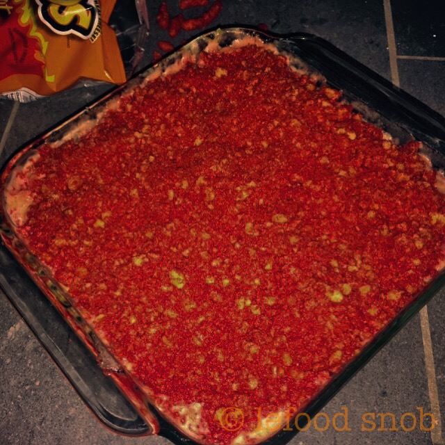 I believe I pulled off the perfect copy-cat dish. Dare I say that my dish might be even better than The Attic’s?! I took a recipe I previously tried that uses chipotle powder and tweaked it slightly. I figured chipotle powder would pair well with the hot Cheetos. (I was right; however, if the Flaming Hot Cheetos provide enough spice for you, you can omit the chipotle powder.) But the real difference, I believe, was the additional layer of cheese I spread on top before topping with Cheetos. I did this because my friend’s voice echoes in my mind. The night we all had our own dish of Mac and Cheetos before us, she mentioned that she liked the dish in spite of the fact that the sauce was creamy. She clarified that she prefers Mac and Cheese that’s stringy, where the cheese stretches out when you bring the fork to your mouth. My friend would be proud of this dish! The top layer of cheese gives that exact effect.