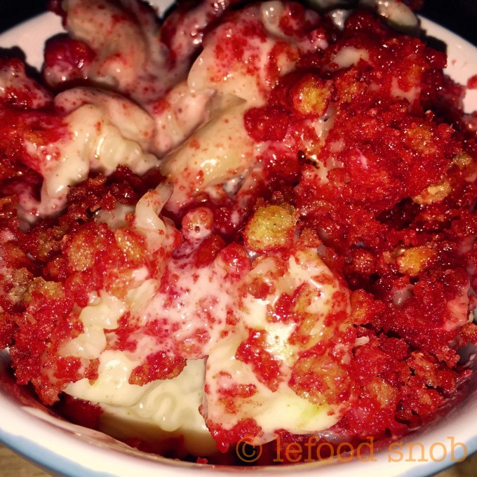 A few weeks ago at a much needed happy hour I was introduced to Mac and Cheetos at The Attic on Broadway. The Attic is known for their Mac and Cheetos made with crushed flaming hot Cheetos on top. That’s the basic Mac and Cheetos dish–a creamy Mac and cheese topped with Cheetos. But you can customize it by adding lots of goodies like bacon, (soy) chorizo, (alligator) andouille sausage, avocado, mushroom, crab, etc. There were three of us at our table and we each ordered our own dish. People stared. It’s a dish meant to be shared as an appetizer but I happen to think it makes a perfect small entree.