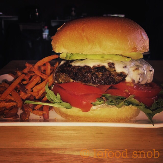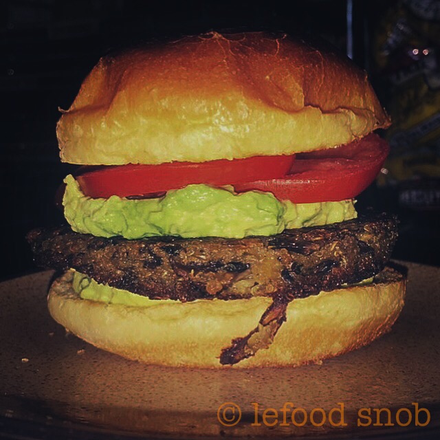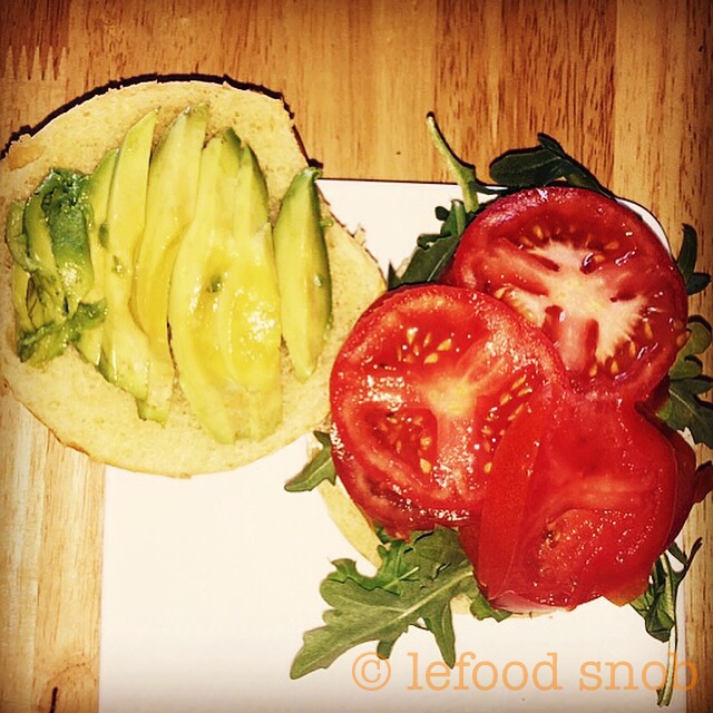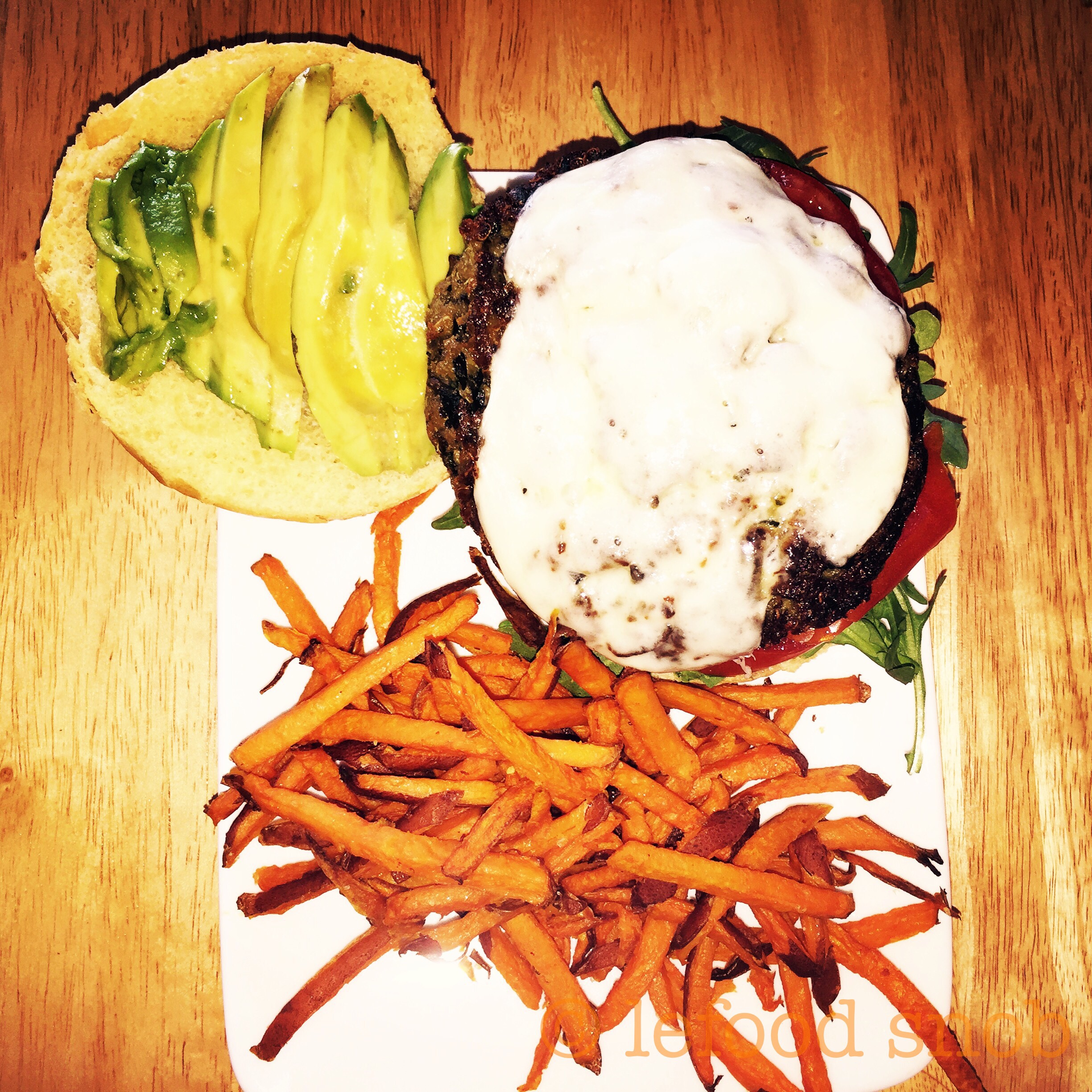I found an awesome looking brioche bun at Fresh and Easy. I spread a tiny amount of olive oil mayo on the bottom of the bun and topped it with arugula and sliced tomato. I topped my burger with melted mozzarella and avocado. It was a bit much. I think because of the complex flavor of the veggie patty, simple toppings would be best. I served my burger with vinegar and sea salt sweet potato (baked) fries.