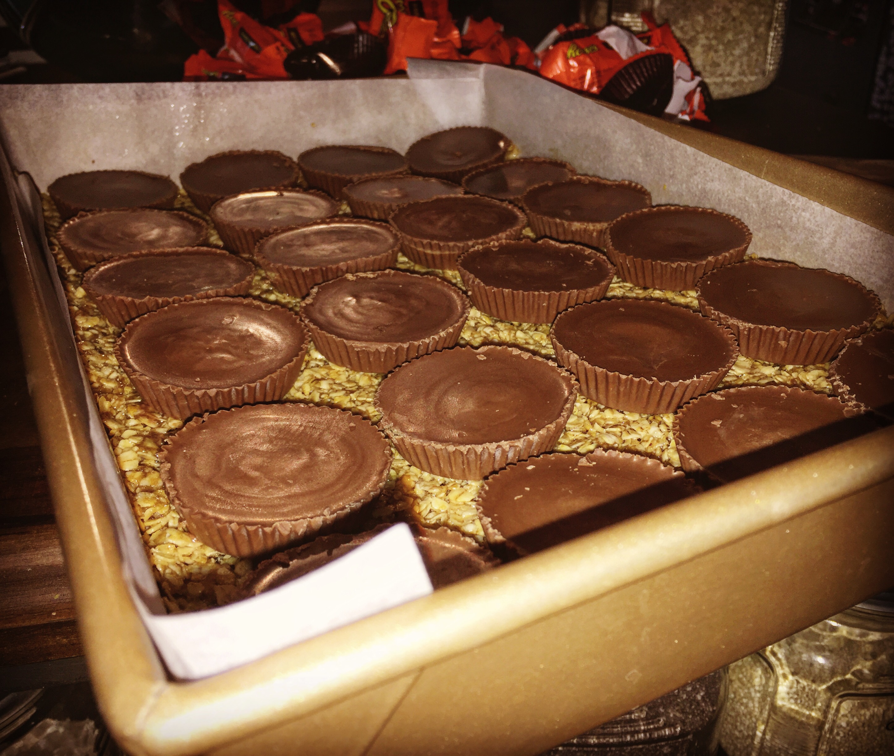 - I made this in two batches, which is why I asked you to divide the ingredients above. I mixed ingredients for one layer first, topped the layer with peanut butter cups, mixed up the second layer next and then pressed that layer on top of the peanut butter cups. Make sense?