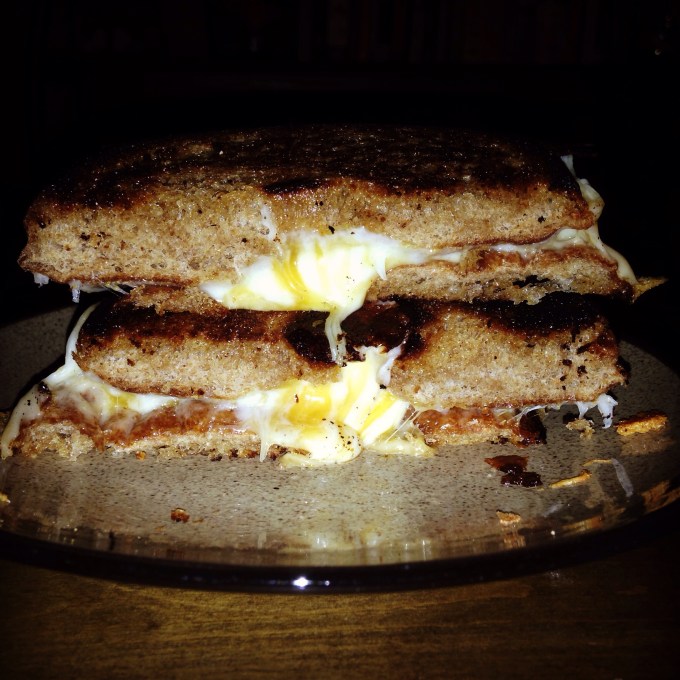 I meant to only eat a bite or two of this grilled cheese sandwich because I was sure it was just going to be OK. I ate the whole thing. It’s different from a regular grilled cheese sandwich for obvious reasons (texture) but I found I rather enjoyed it the delicate sponginess of each bite. Not that I would go out and buy bagels specifically to make grilled cheese. But I figured the next time there were surplus office bagels I would be as eager, if not more, to swipe some. I decided after the success of the first grilled cheese bagel sandwich to do a breakfast version for my next go round and butter the outsides of the bagel instead of the insides. Stay tuned!