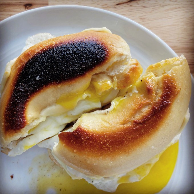 So let me again reiterate that this sandwich just had too much going on for me. I think it would have been good with just bacon and egg — it would have made it seem like a real grilled cheese (bagel) sandwich versus a breakfast sandwich with melted cheese.