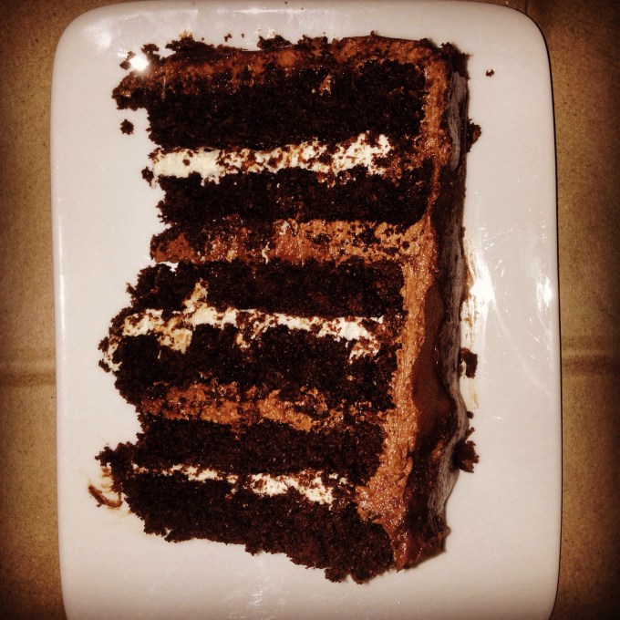 I used mini-marshmallows instead of regular-sized ones. This was in an effort to mitigate the squishy texture of the marshmallow within the filling. The effect it had was to create bits of crystallized marshmallow. It was kind of crunchy which would normally turn me off, but somehow in this filling it worked really well. So well, in fact,that I wish that the marshmallow filling had been in between each layer. So that’s what I would change if I ever made this cake again. You would need to double the recipe to do so.