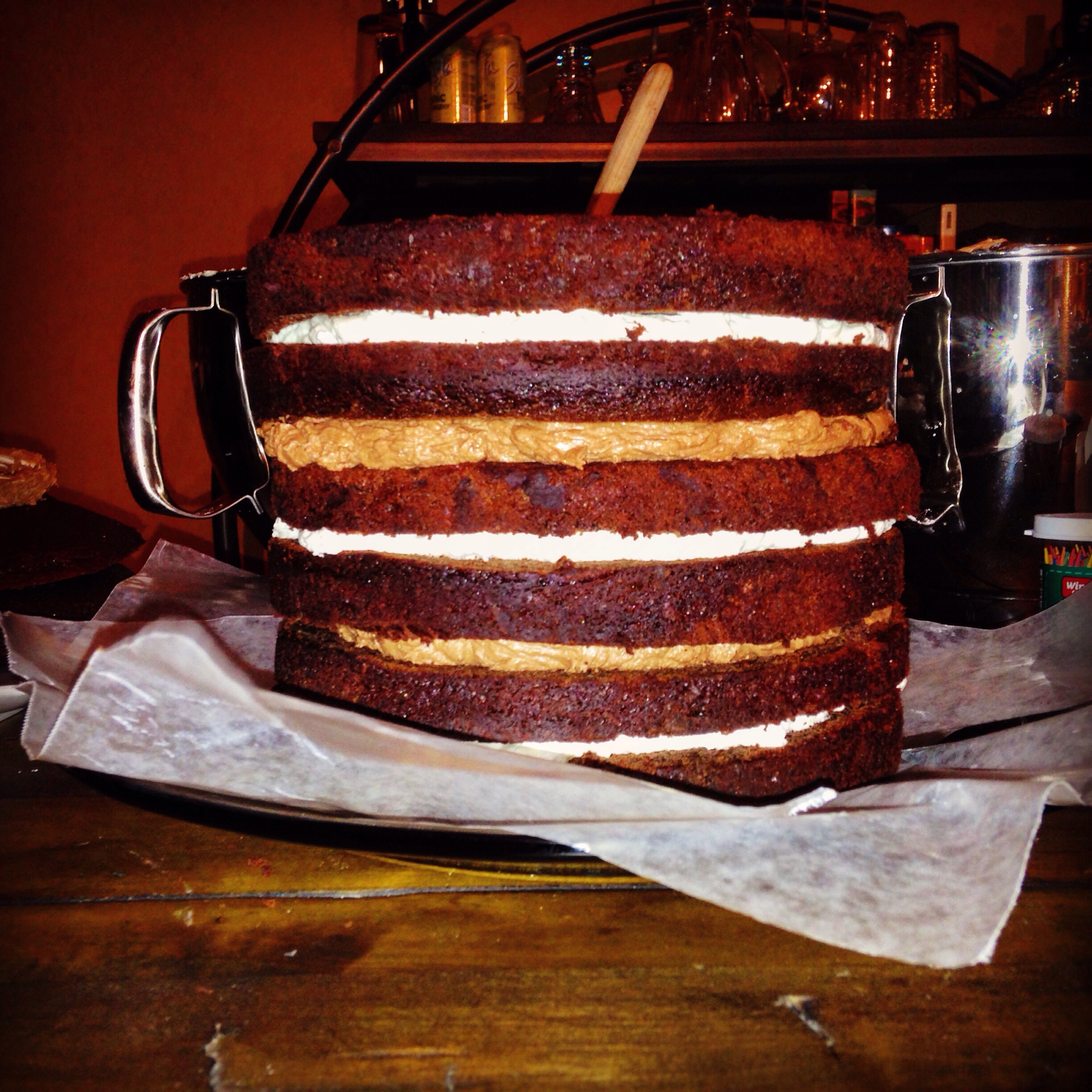 This recipe is floating around the internet and Pinterest and I’m not sure who originated it but I grabbed the recipe off Brown Eyed Baker’s website. I used my own chocolate cake recipe for Chocolate Coca Cola cake because my coworkers have had it and loved it, so really I only borrowed the filling/frosting recipes. Brown Eyed Baker’s cake sounded good and looked good in her pictures though. So I wouldn’t necessarily recommend switching out her cake recipe for another one.