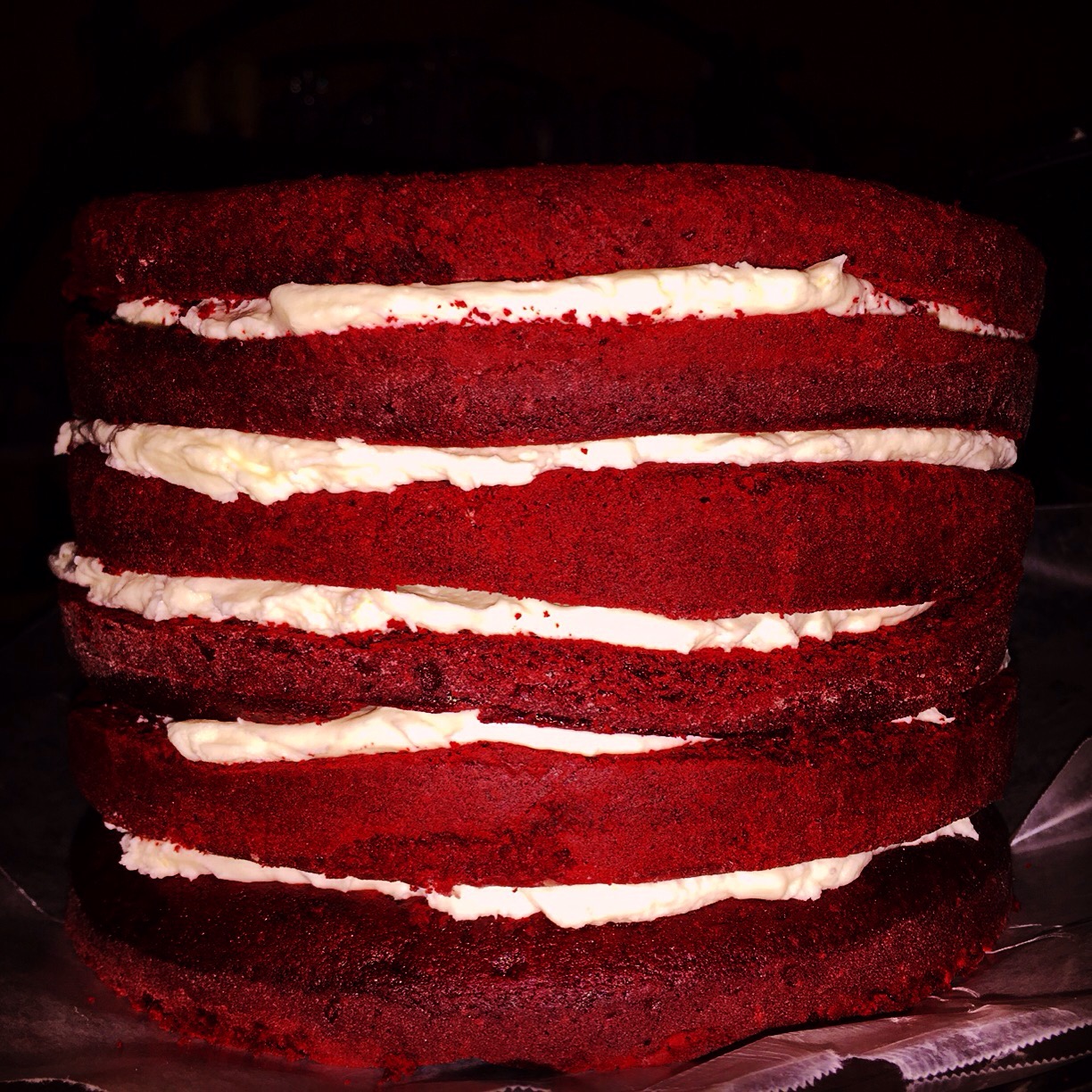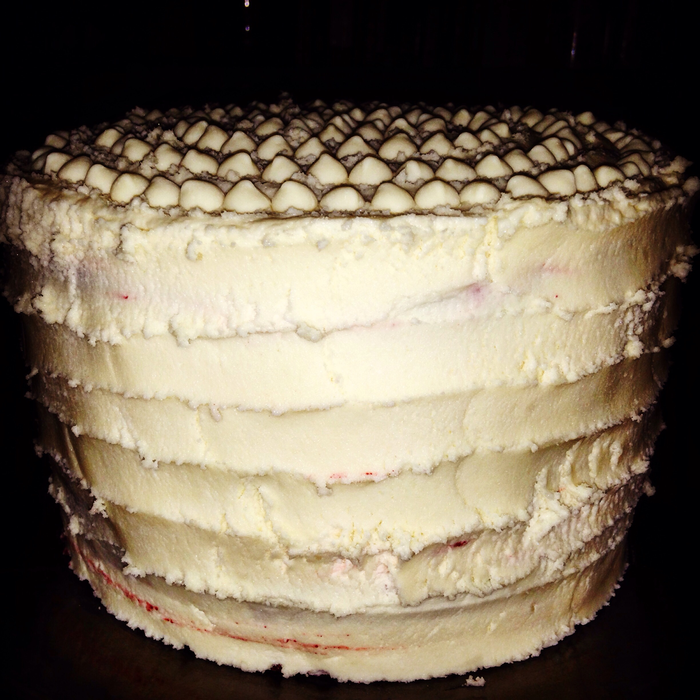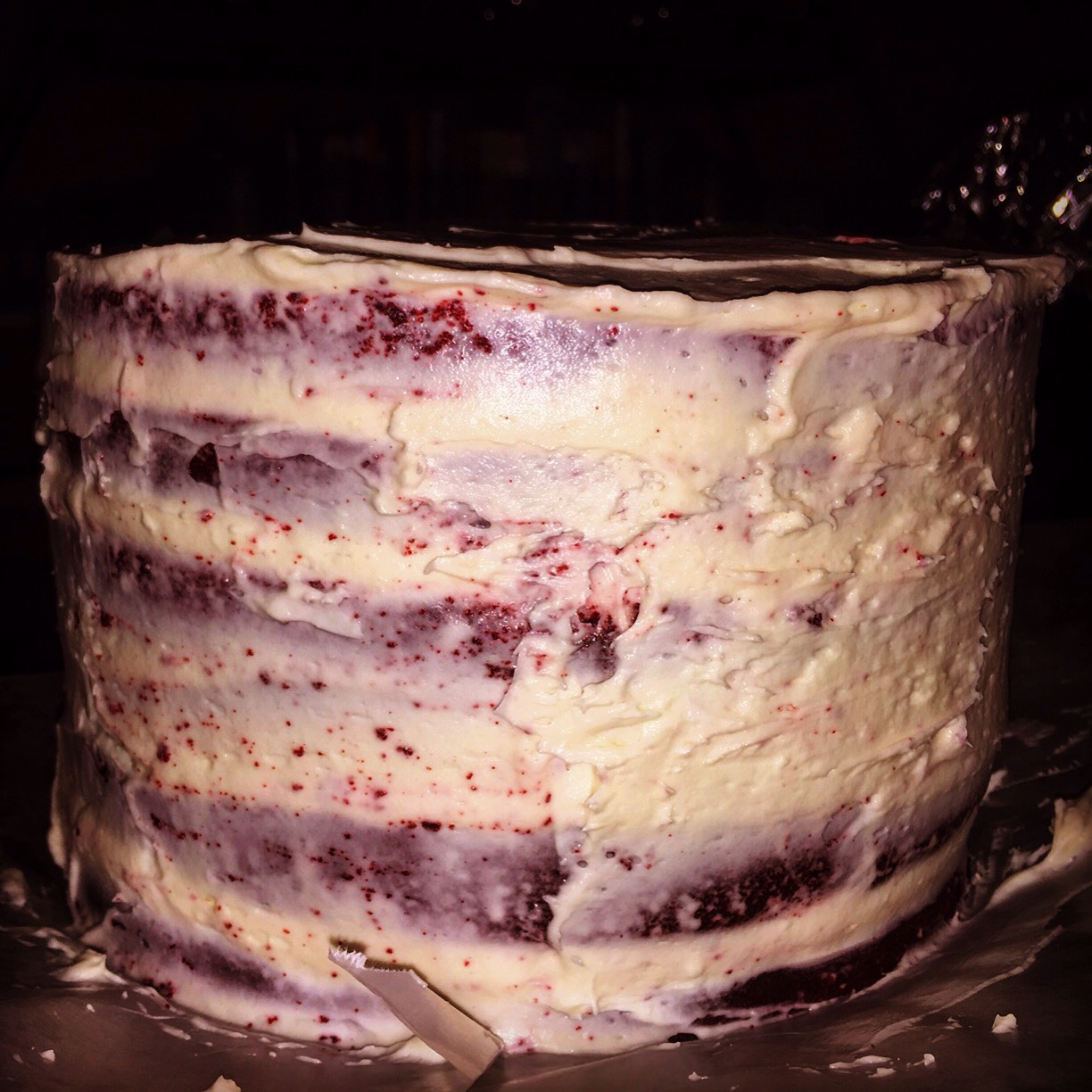 Red velvet cake is hard to frost because the red coloring tends to bleed through. I did a quick crumb layer, chilled the cake, and then coated the cake a second time with a verrrrrrrry thick layer of cooked frosting. Two thinner layers would have worked equally as well.