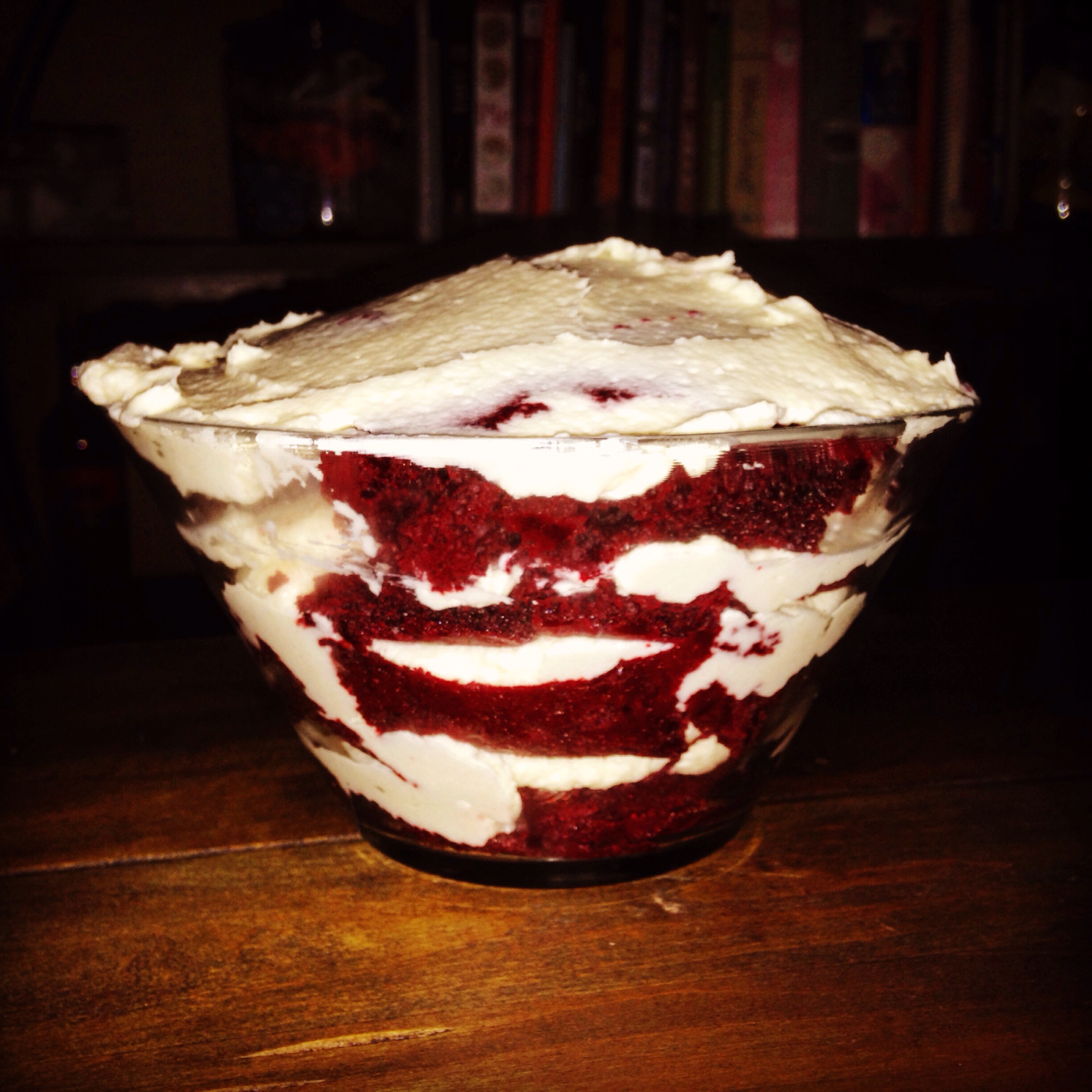This cake turned out to be one of the better ones I’ve ever made. Why? I’m not sure. I do know that red velvet cake in general can happen to over-bake rather easily. Since I’m cognizant of that, I do my best to not let that happen when I make red velvet cake. This cake was perfectly moist. I ran out of cream cheese frosting and made a double recipe of cooked frosting sans cream cheese (I didn’t have any on hand!) which I used to finish frosting the cake and to make those gems of parfaits you see above.