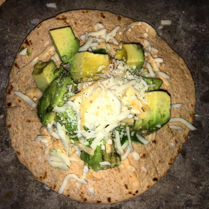 This recipe is a riff from one that Bobby Flay does with bacon and hash browns. I’ve tried this recipe before using bacon. Today I used what I had on hand in my fridge (chicken sausage breakfast links and avocado). I mean you can make a breakfast quesadilla out of almost any breakfast food, right?