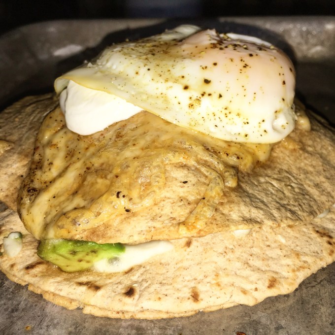 - Remove quesadillas from the oven. Top with a dollop of sour cream, if you’re so inclined. Top with the fried eggs and any other garnish you may be using.
