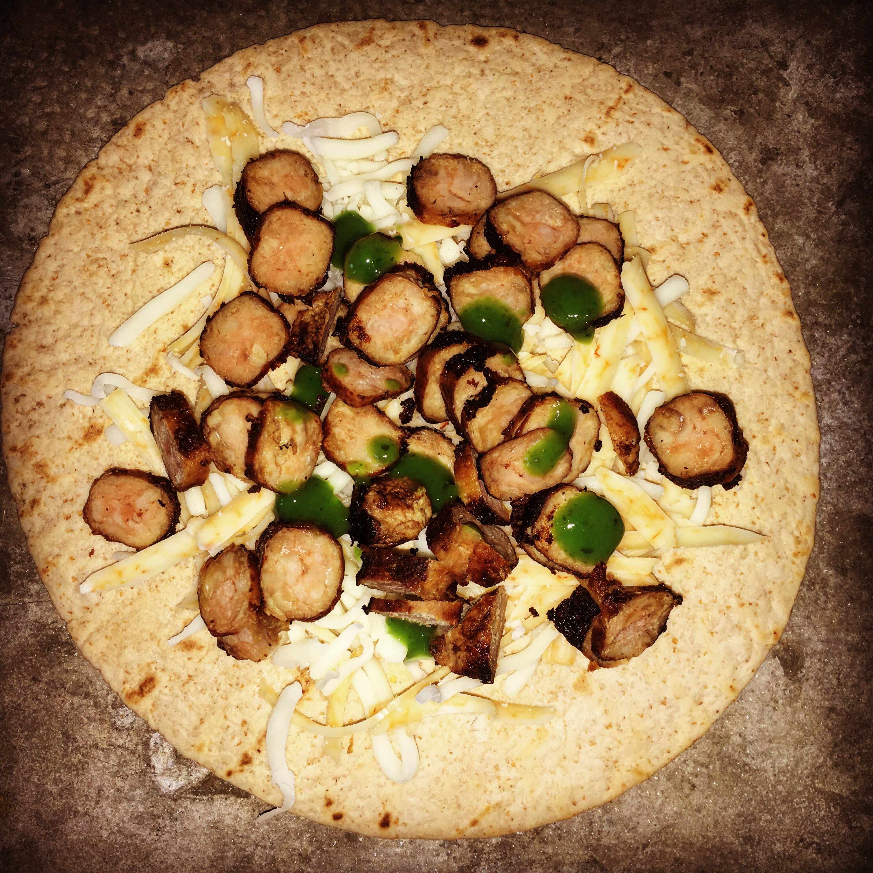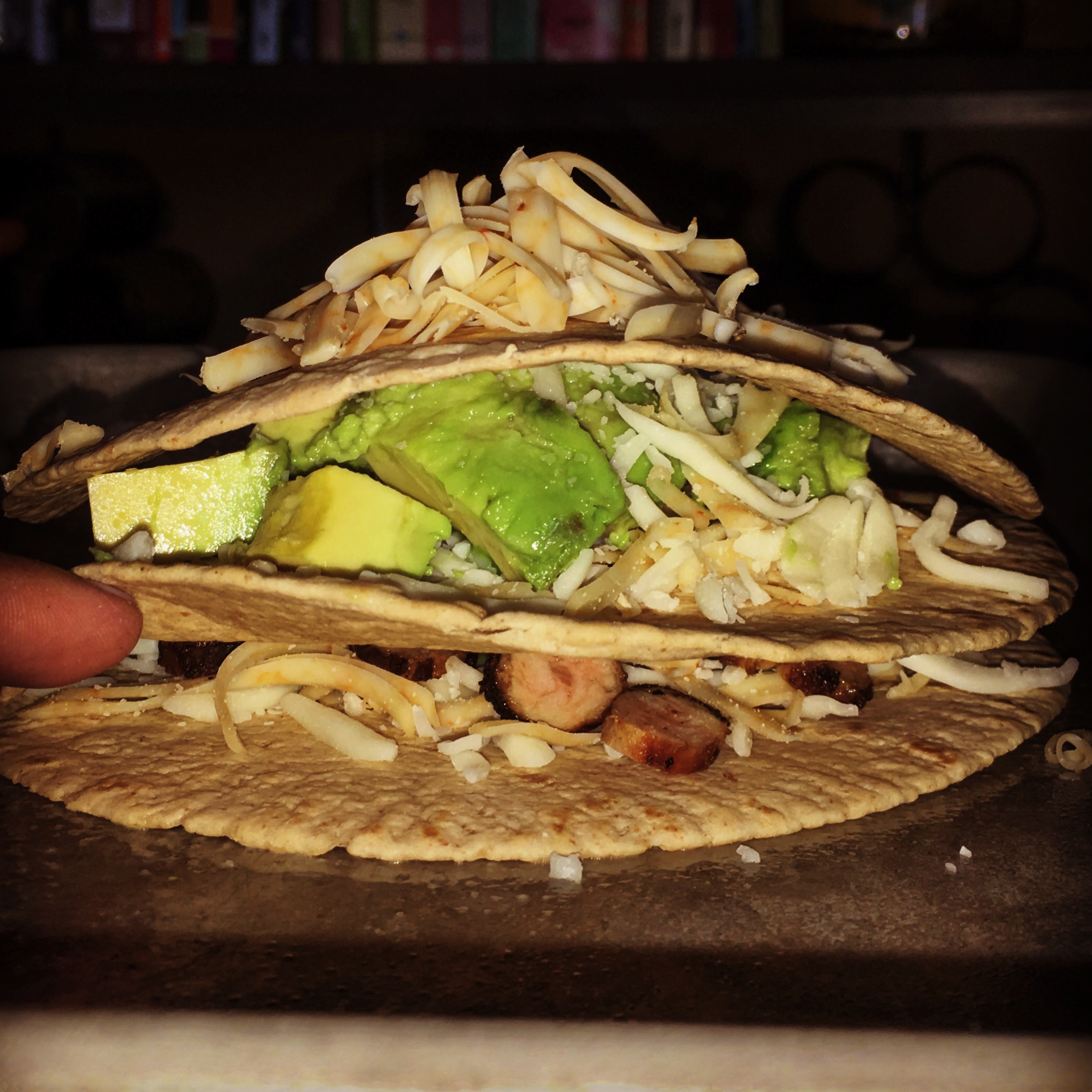 This recipe is a riff from one that Bobby Flay does with bacon and hash browns. I’ve tried this recipe before using bacon. Today I used what I had on hand in my fridge (chicken sausage breakfast links and avocado). I mean you can make a breakfast quesadilla out of almost any breakfast food, right?