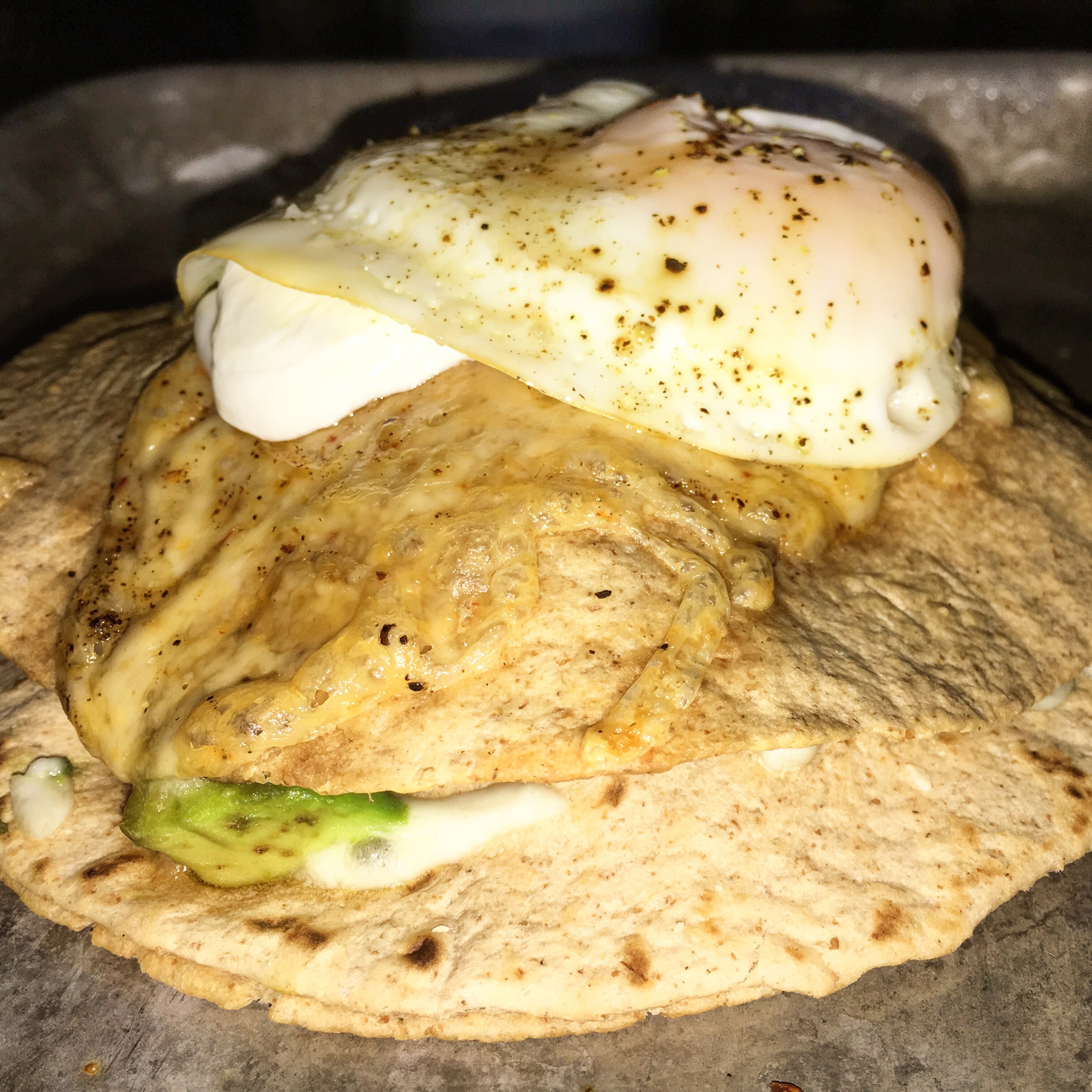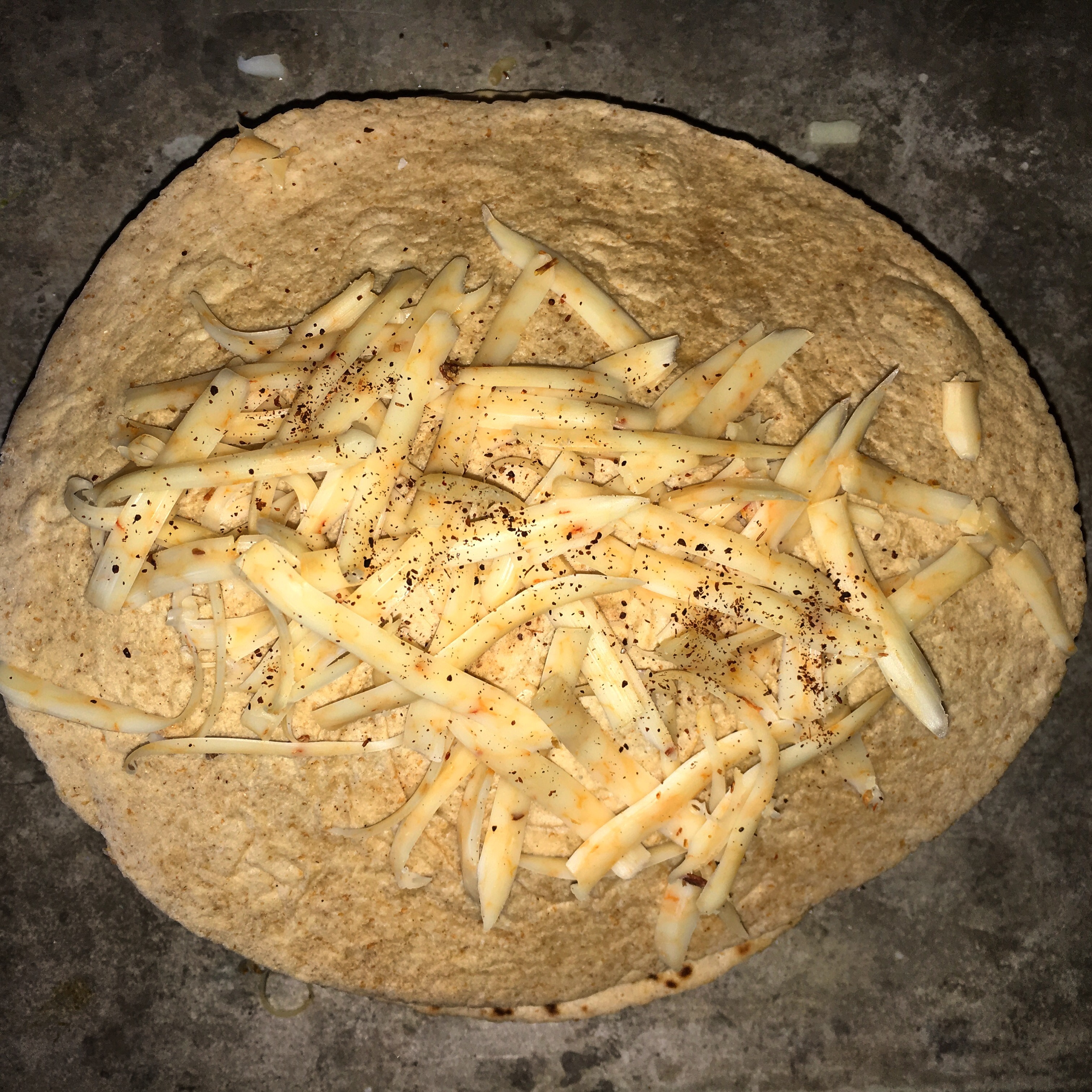 - Lay out 4 of the tortillas on a work surface. Top each tortilla with a sprinkling of cheese and your breakfast meat choice. Sprinkle with hot sauce if you’re so inclined. (Don’t be skimpy on the cheese!) Top each with with a tortilla and sprinkle with cheese. Add some avocado to the cheese. Sprinkle with hot sauce if you’re so inclined.Top each tortilla stack with the remaining tortilla. Sprinkle a bit more cheese on for good measure. Sprinkle the cheese with a bit of the ancho chilli pepper.