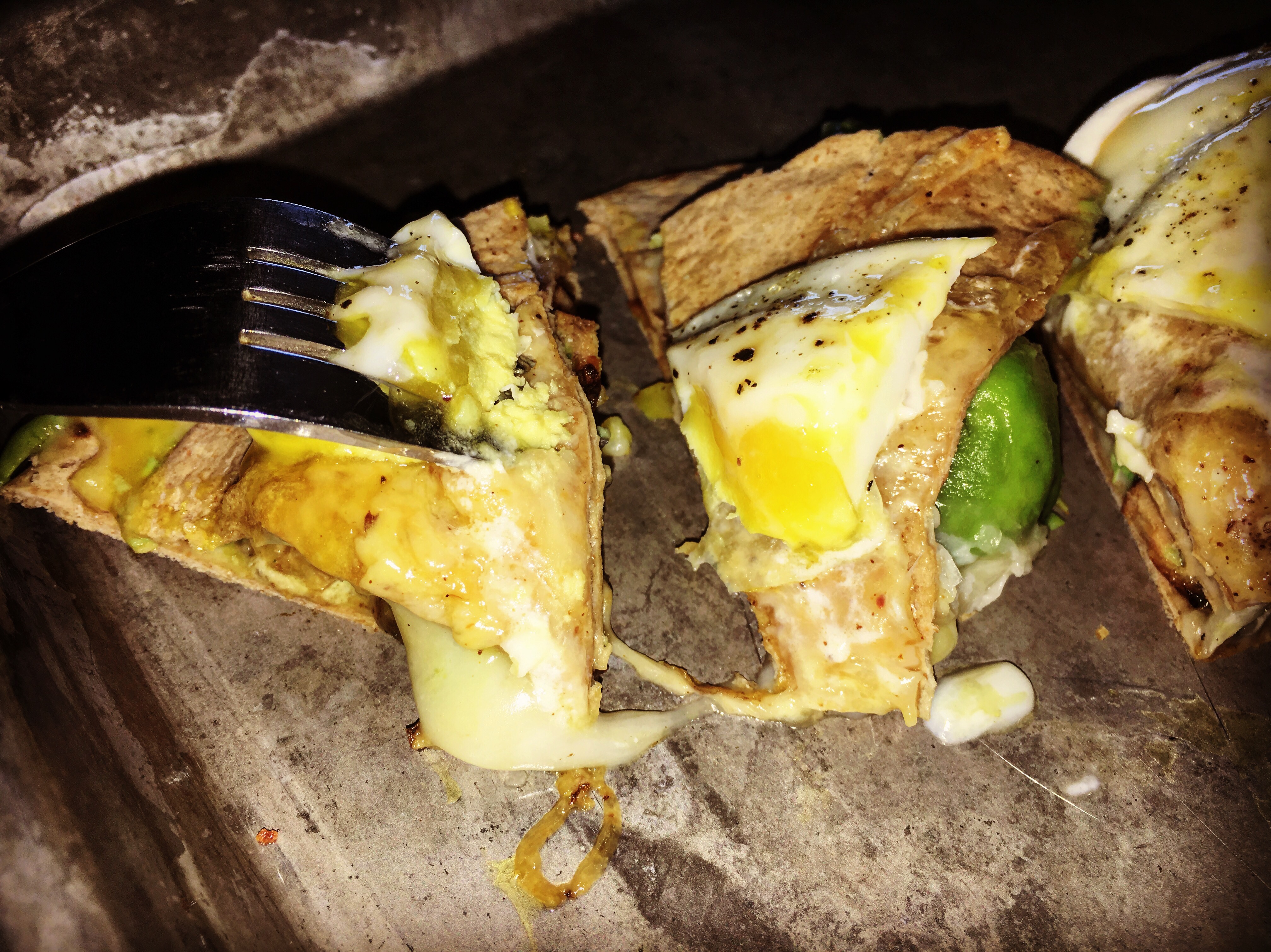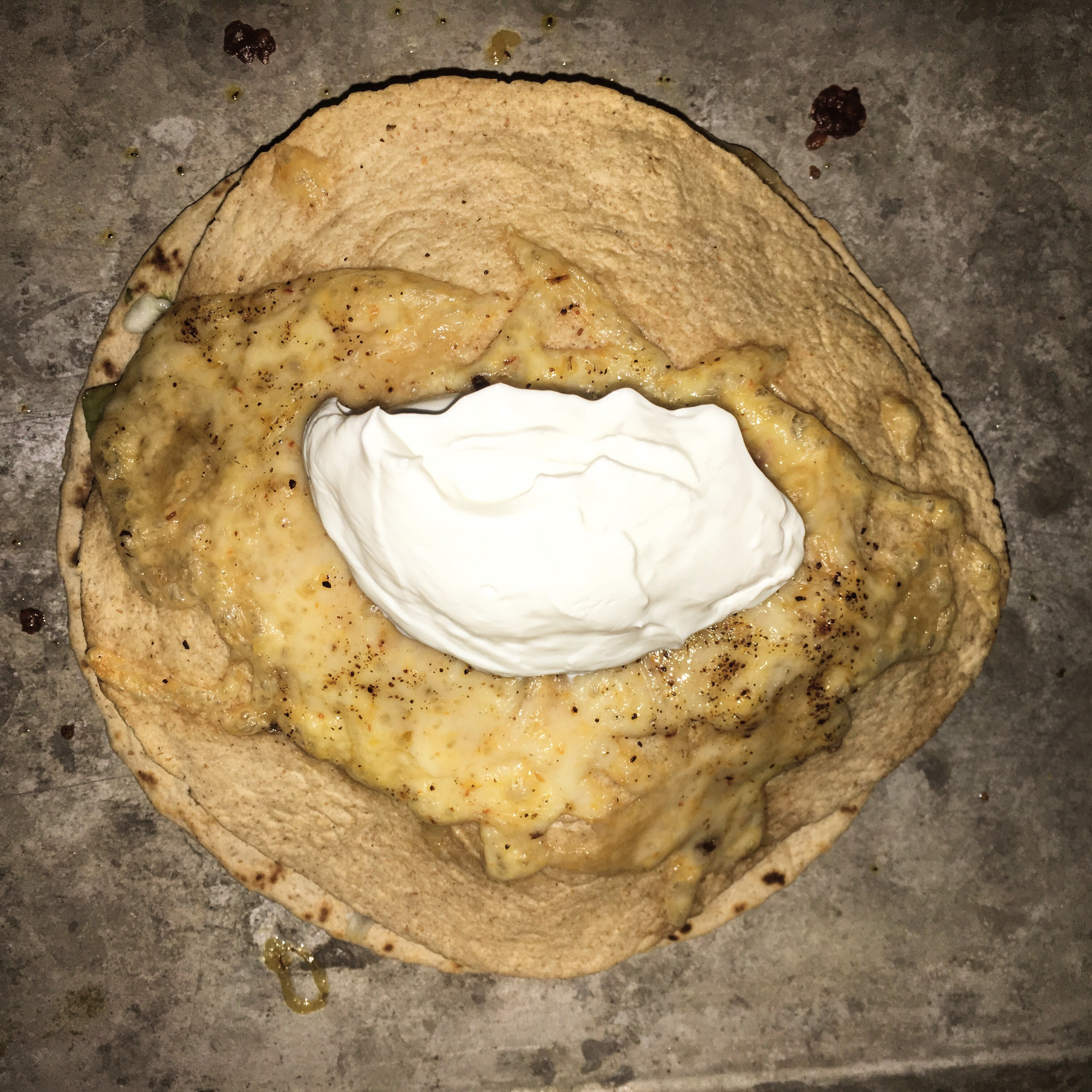 - Remove quesadillas from the oven. Top with a dollop of sour cream, if you’re so inclined. Top with the fried eggs and any other garnish you may be using.