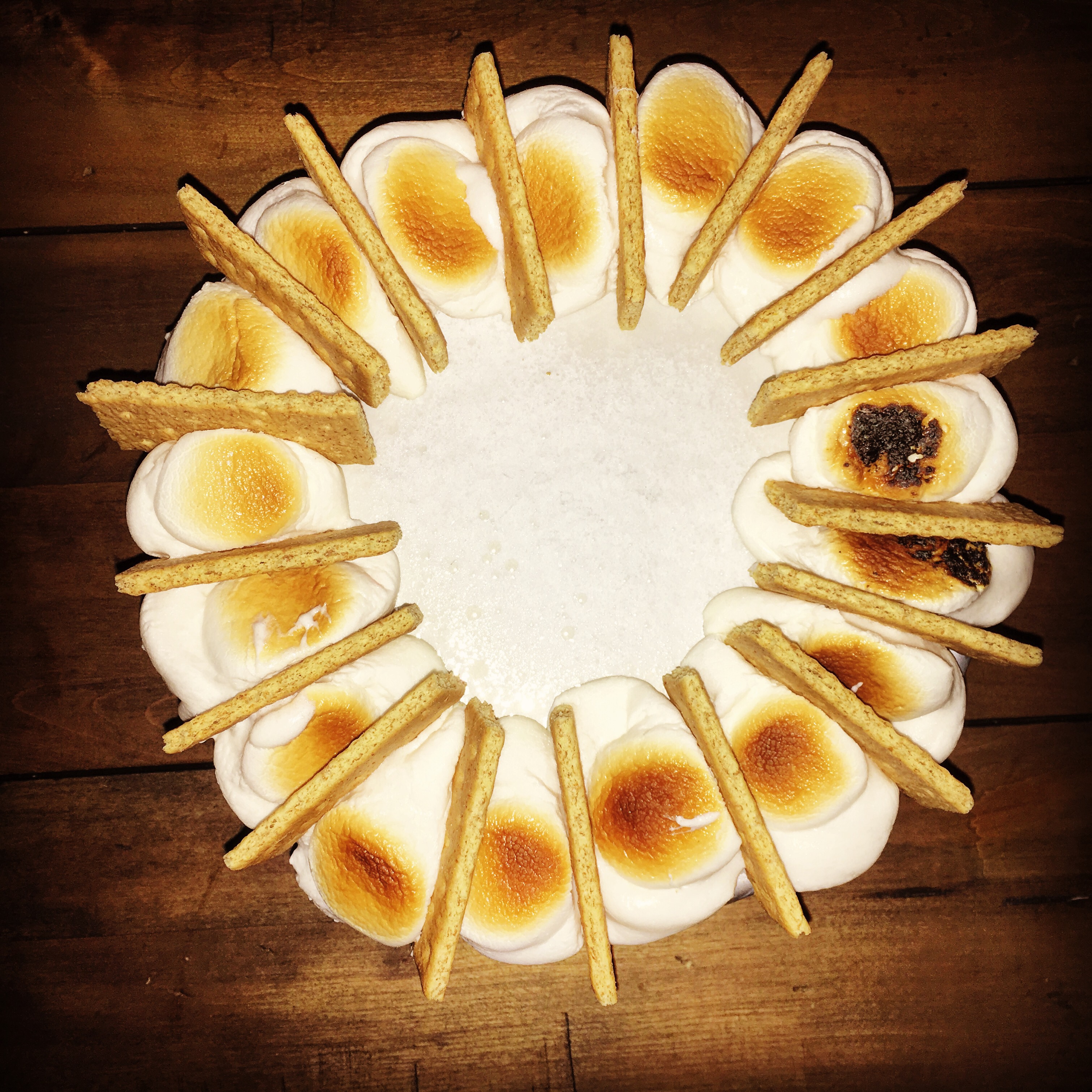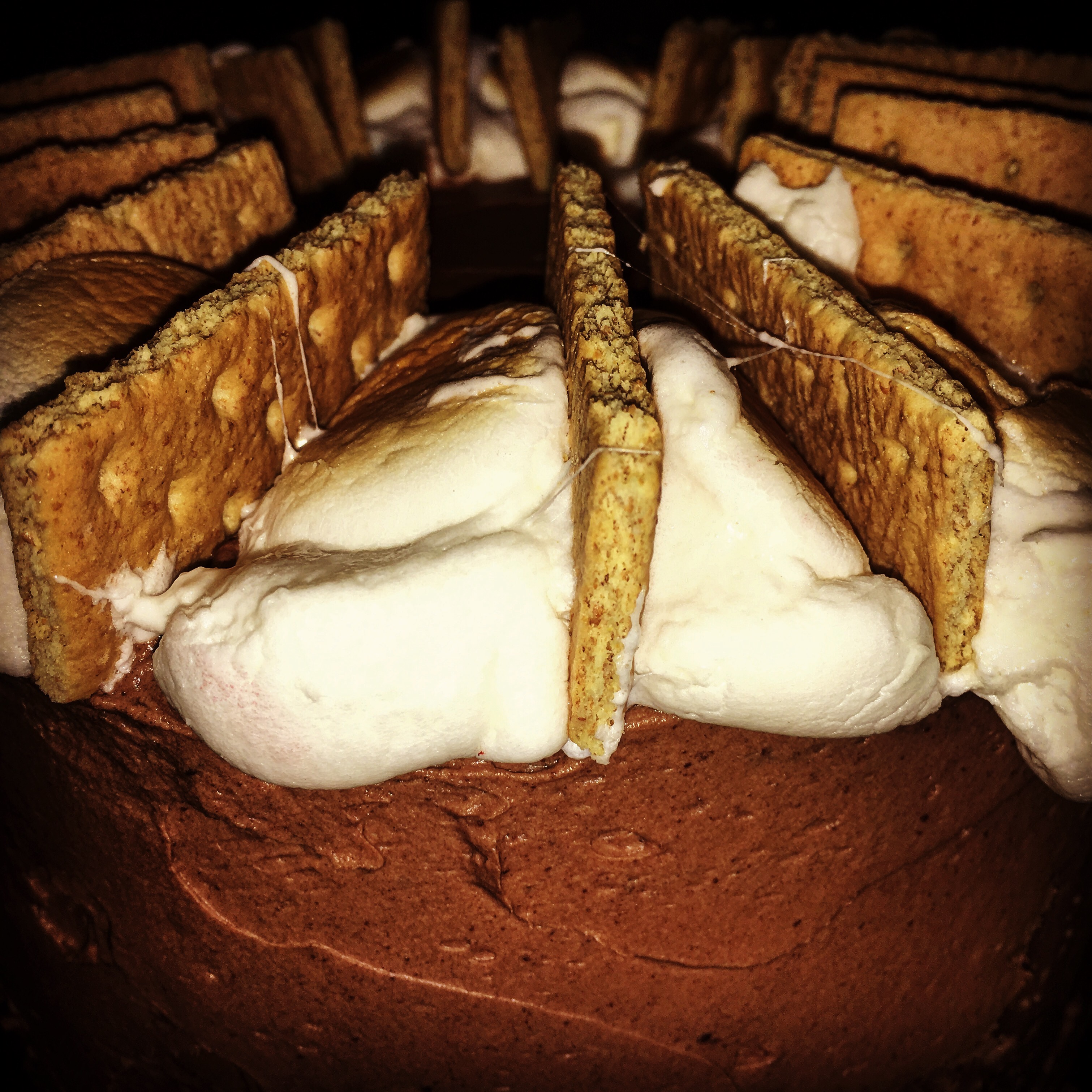 Then I attempted to stick the graham crackers in between. I should have stuck the grahams in between the marshmallows before toasting because it was difficult with the meltiness of the marshmallows to try to stick the grahams in between. It ended up fine, I would have done it differently in hindsight. Then once the marshmallow-graham ring had cooled slightly, I moved the ring on top the cake in sections. I had to allow the ring to cool because I didn’t want the hot marshmallows to melt the ganache frosting.