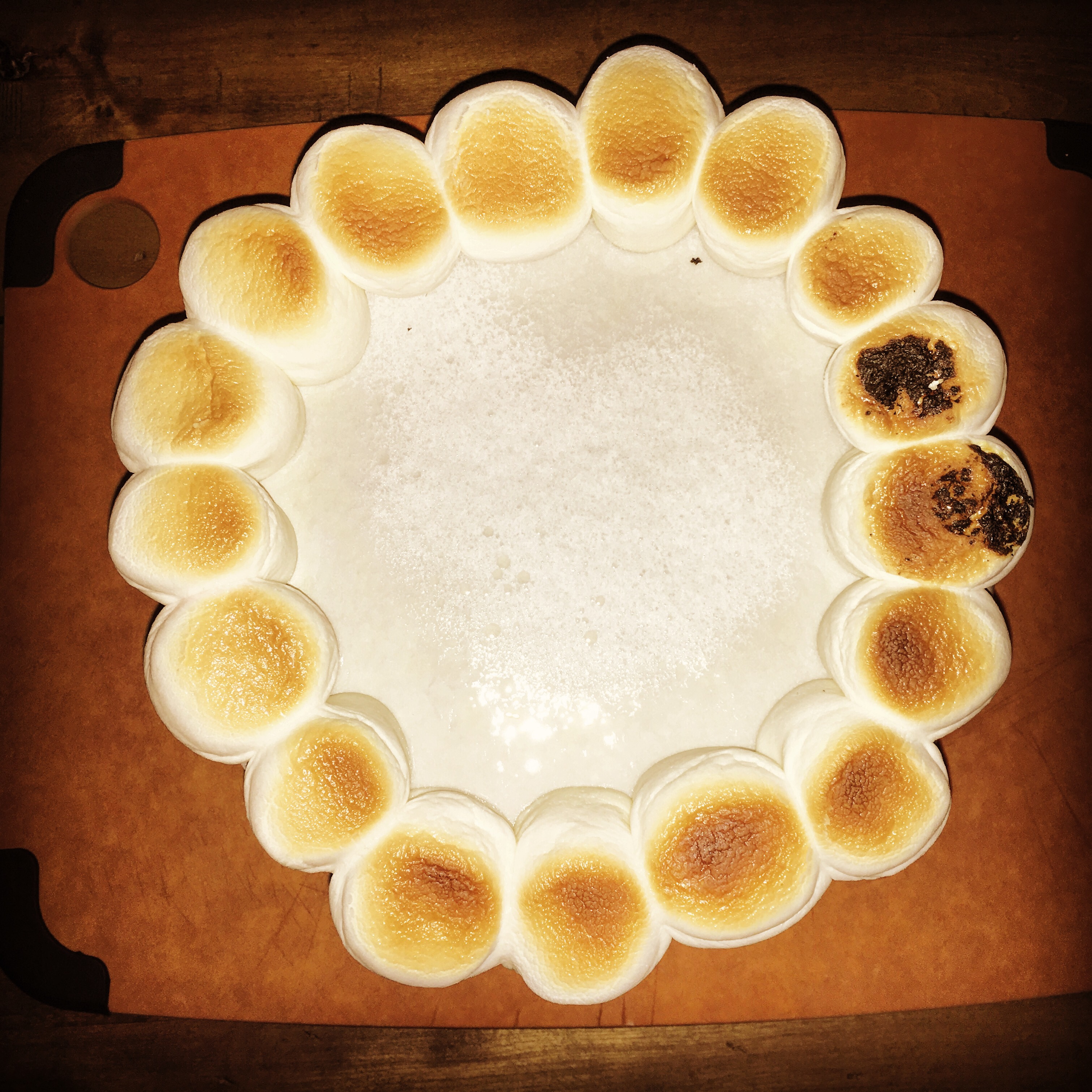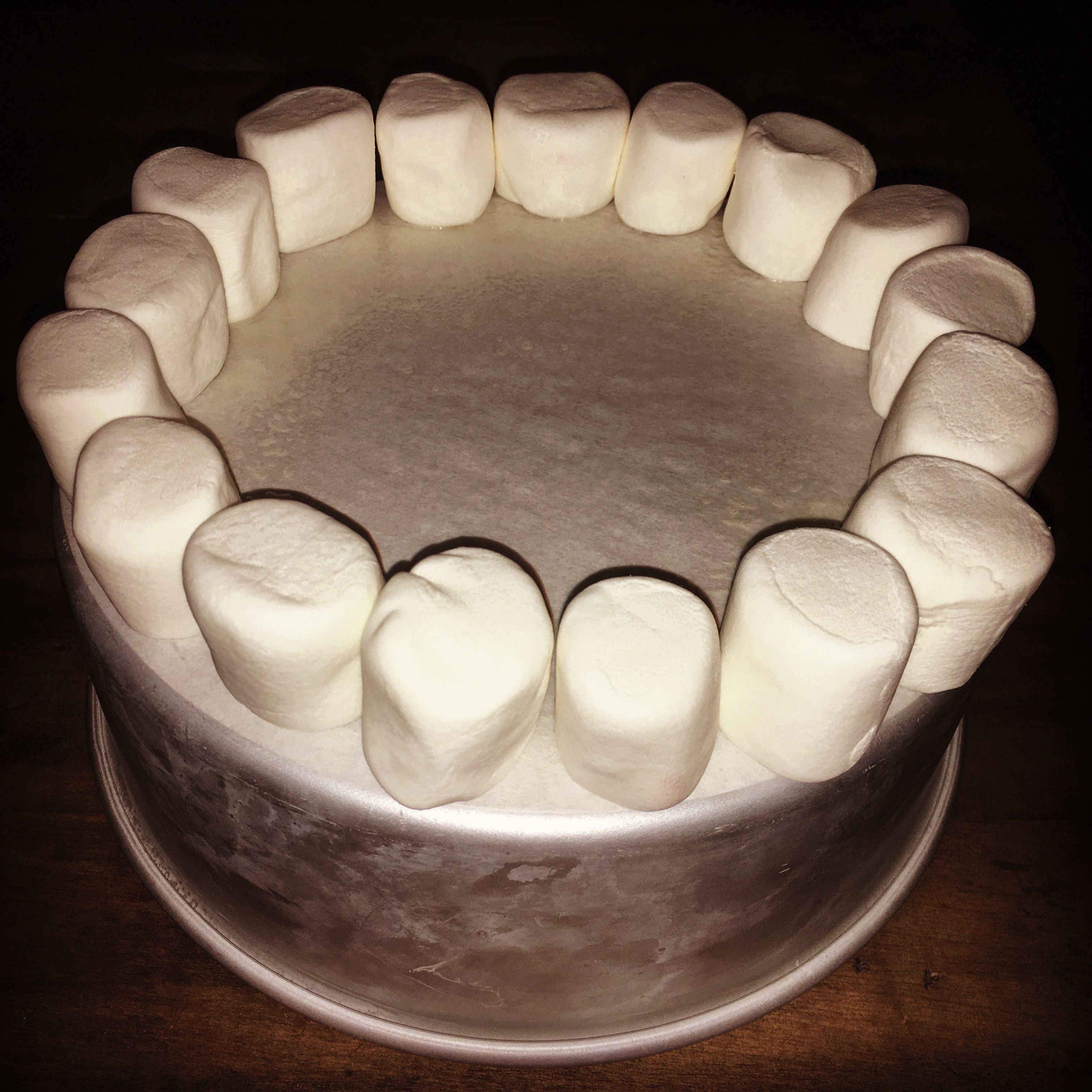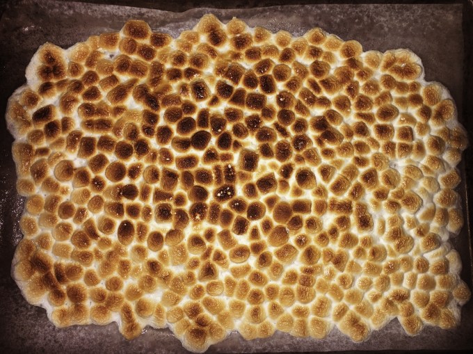 Turns out that trying to toast a regular-sized marshmallow takes forever using one of those wands. So I discarded that idea. I decided to flip over the pan I used to bake the cake and line it with parchment paper and then spray the parchment paper with cooking spray. I lined up the marshmallows along the outside and threw the pan into the bottom rack with the setting on broil. After a few minutes (and one rotation) I had evenly browned, melty, toasted marshmallows.
