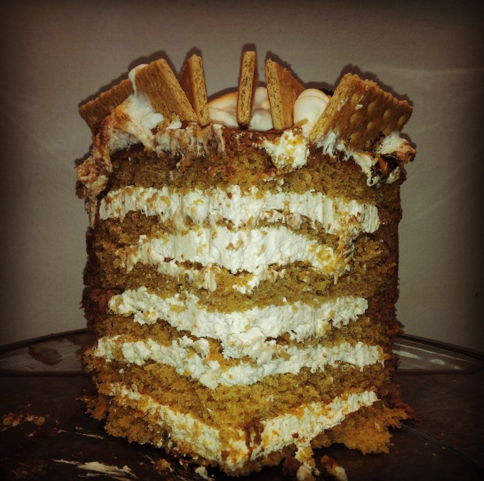 I’m not sure why but I’ve been obsessed with S’mores recently. I like marshmallows. I like chocolate. I’m not overly fond of graham crackers or their taste. Yet when my favorite local cupcake shop offered S’mores as their flavor of the month in June, I was all over that sh!t. And it inspired me to make a layer cake of the same variety for my birthday this year. Their cupcake involved a graham cracker cake base, chocolate frosting and toasted marshmallows complete with a tiny cram square stuck into the delicious chocolate frosting. Easy as pie to create a layer cake based off that cupcake, right?