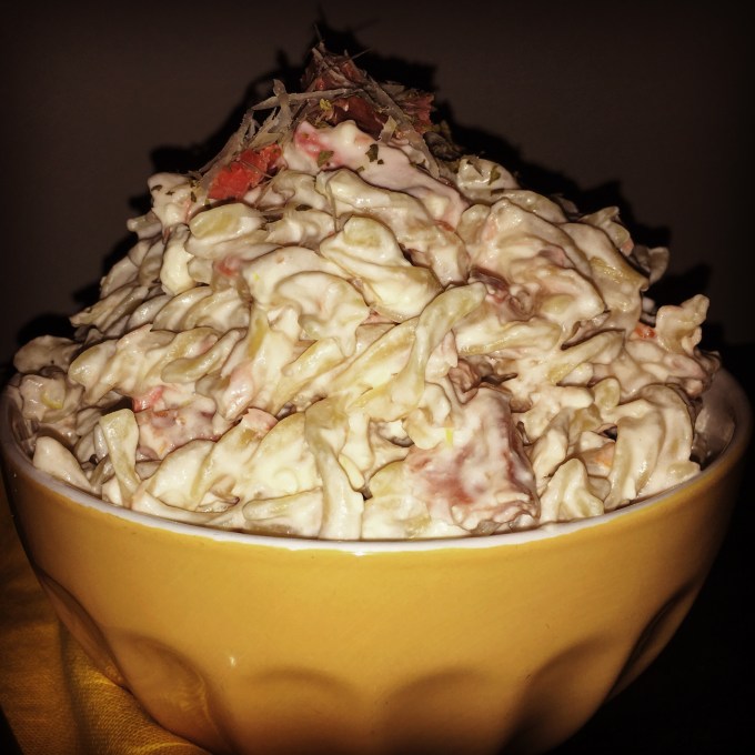It was determined after the Saturday night fat bomb late night snack that a lightened up dinner was needed on Sunday. I’ve always shied away from using Greek yogurt in pasta because… Why would I want to eat pasta unless it was full of fat? However, I was persuaded to try Greek yogurt in pasta just this one time if I could find a recipe that looked appealing. And then if I didn’t like it … I wouldn’t have to try it again. I have always said I’ll try anything food or drink-related at least once. So why not give Greek yogurt in pasta a whirl, right?