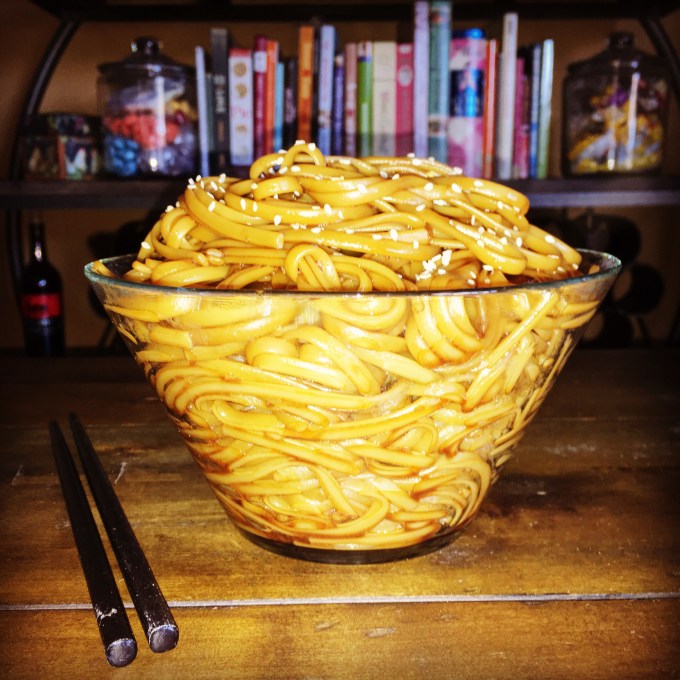 At first I was really excited to eat this dish. Then as I was adding the finishing touches to the dish (the sesame oil), my happiness eroded a bit. The noodles looked kind of blah when all was said and done. Who wants ho-hum noodles? I certainly don’t. But then after I took my noodle pics, I dug in with my chopsticks, which is not an easy feat. I’ve never been great with chopsticks though I can do fine with sushi. It’s noodle or rice dishes that perplex me. Anyway, I dug in with my chopsticks and low and behold, there was nothing ho-hum about this dish. It was amazing. I kept trying to shovel in big bites of the steaming hot pasta as best I could with the chopsticks, anyway. It took me a while to work halfway through the bowl and then I was sniffling either because it’s a bit spicy thanks tot the hot sesame oil I used or I ate too much. My body tends to tell me I overindulged by giving me the sniffles. This pasta dish is spicy, salt and sweet all at the same time. Normally I don’t like “sweet” entrees. Sweet should stick to dessert! But for these noodles I will make an exception.