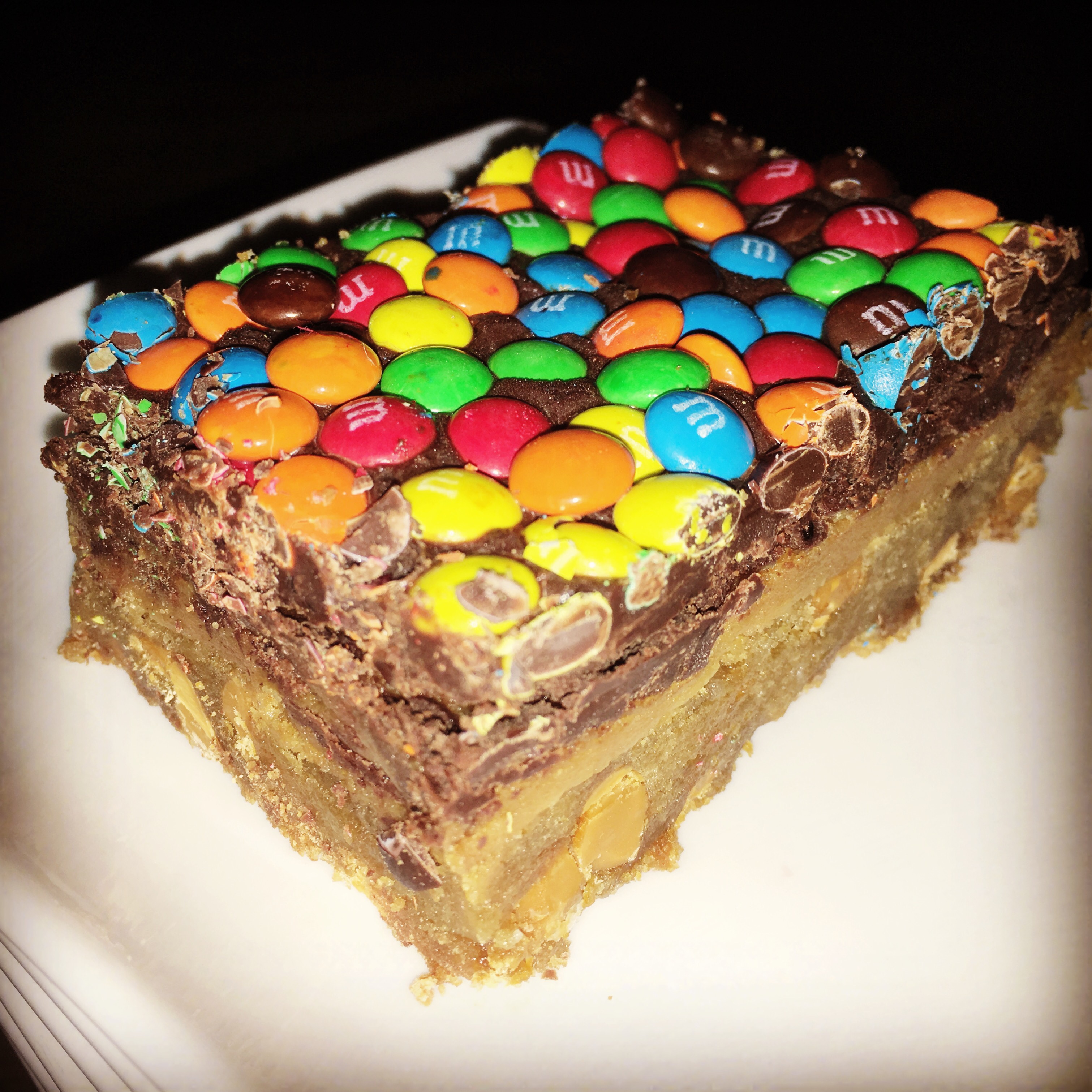 But here’s the magic part in all of this. Oftentimes when something starts out as a disaster, it turns into something beautiful. Well. I can’t account for what happens in life but I will attest to this in cooking. These bars are amazing. After covering them in m&ms I was worried there would be too much going on in these bars but biting into them put my fears to rest. I forgot how much I loved the m&m donut from Voodoo donuts until I took the first heavenly bite of this bar and was reminded of just how much I love mini m&ms in dessert.