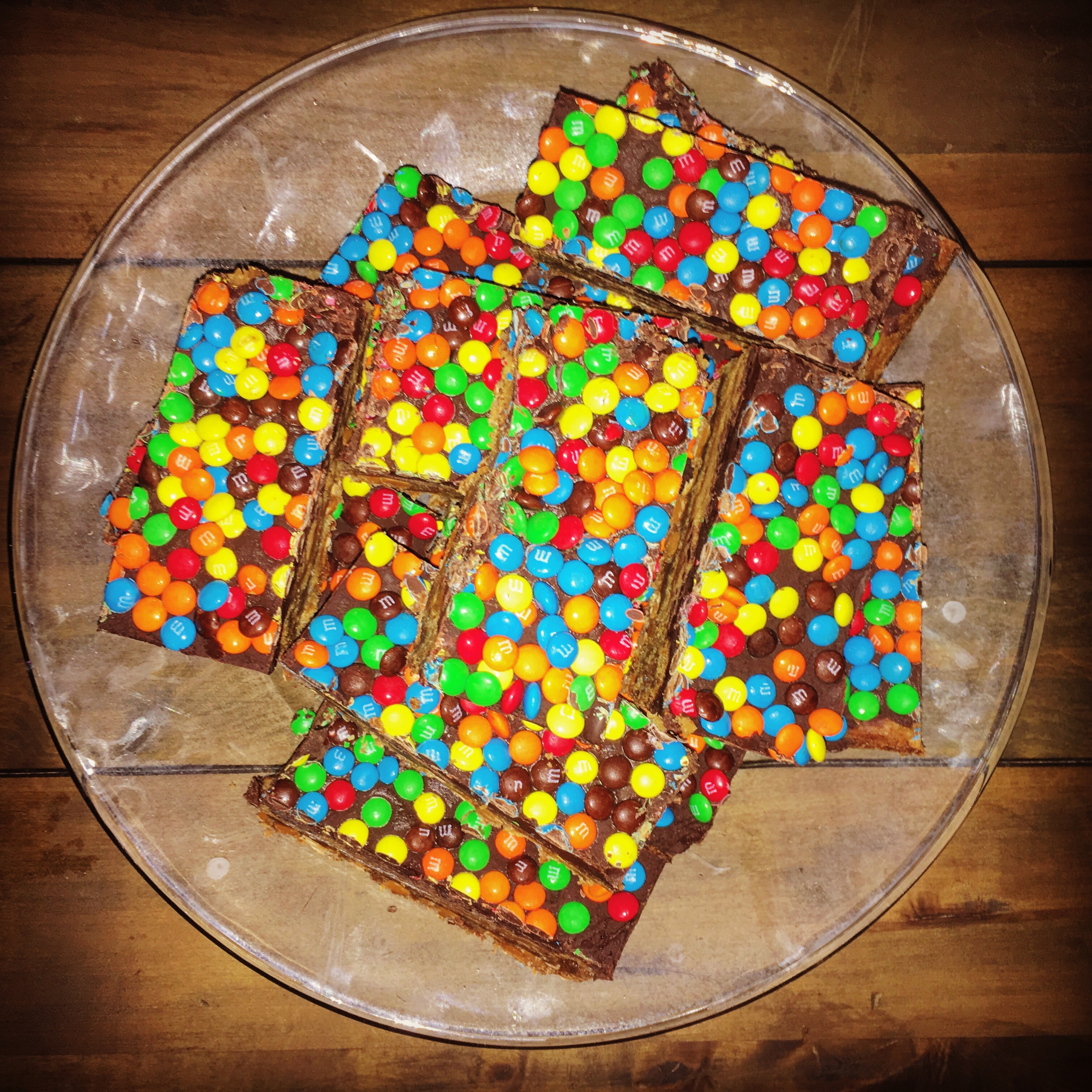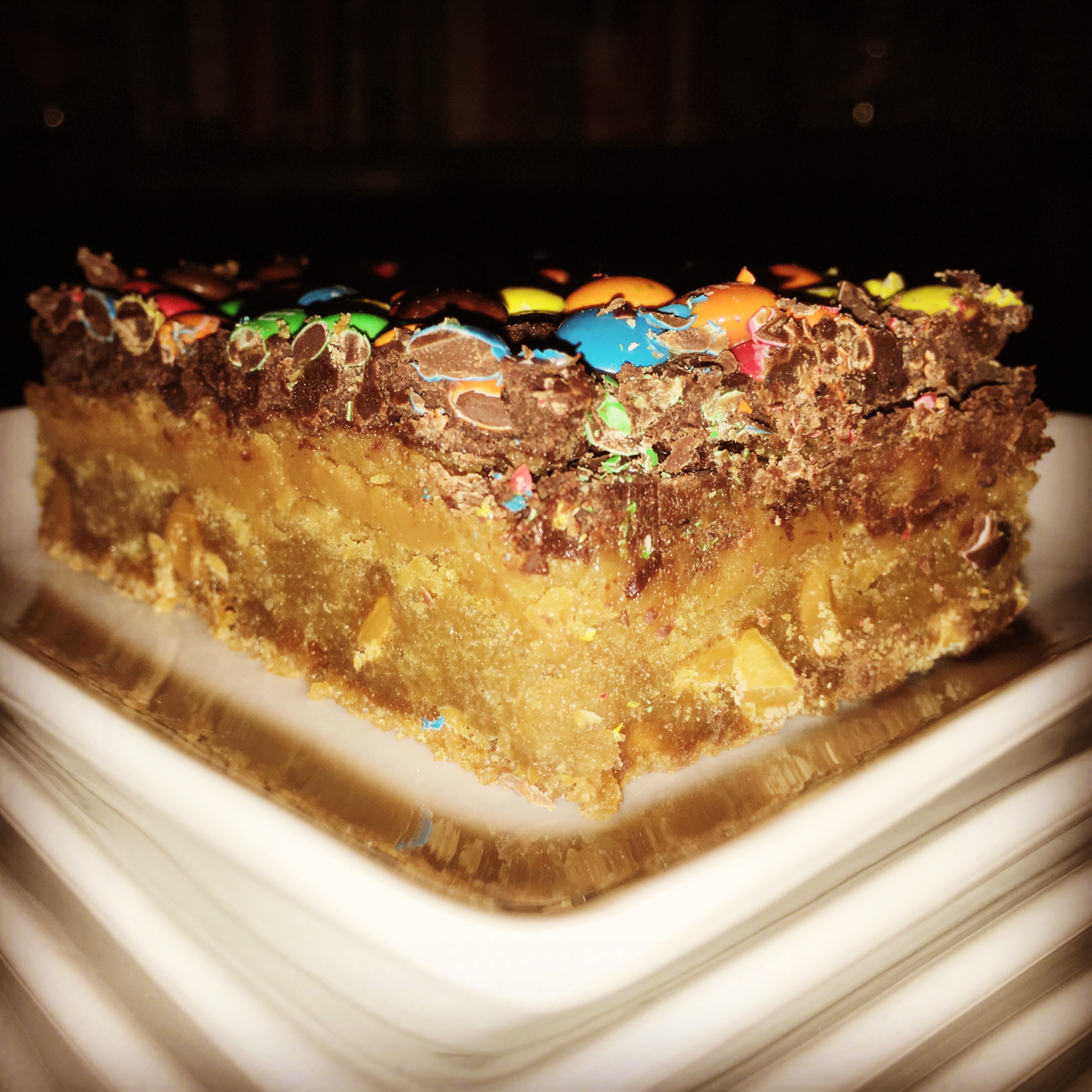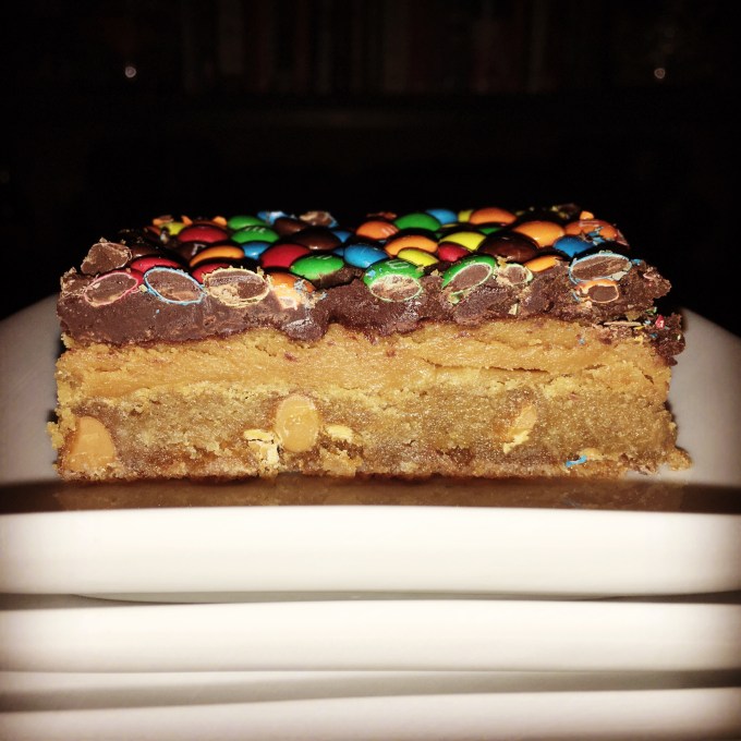 Pfft. Somehow when I was ignoring the double-boiler directions (same as I had last time) I ended up scorching the chocolate and butter. I refused to toss 16 ounces of chocolate. So I began to add more butter to try to smooth it out. Well that never happened. Several butter and margarine additions later I got a thick, gravelly chocolate looking FROSTING. I was not intending for a FROSTING. This was supposed to be ganache! Grr. I spread it across the blondies anyway. And as I sat there staring at it, I knew that even if the chocolate “firmed up” it wasn’t going to look or taste like ganache. To cover up the embarrassment of my error, I threw a bunch of mini m&ms on top. Now this project was so belabored with so many different conflicting flavors I just knew it was an entire pan of blondies I probably wasn’t going to be able to share with anyone. Except for maybe a neighbor or two that I happen to dislike and wouldn’t care if they thought my blondies were bad/over-the-top/burnt. I was so horrified by the whole ordeal, I didn’t take any pictures along the way. I couldn’t have evidence of such failure mocking me on my phone.