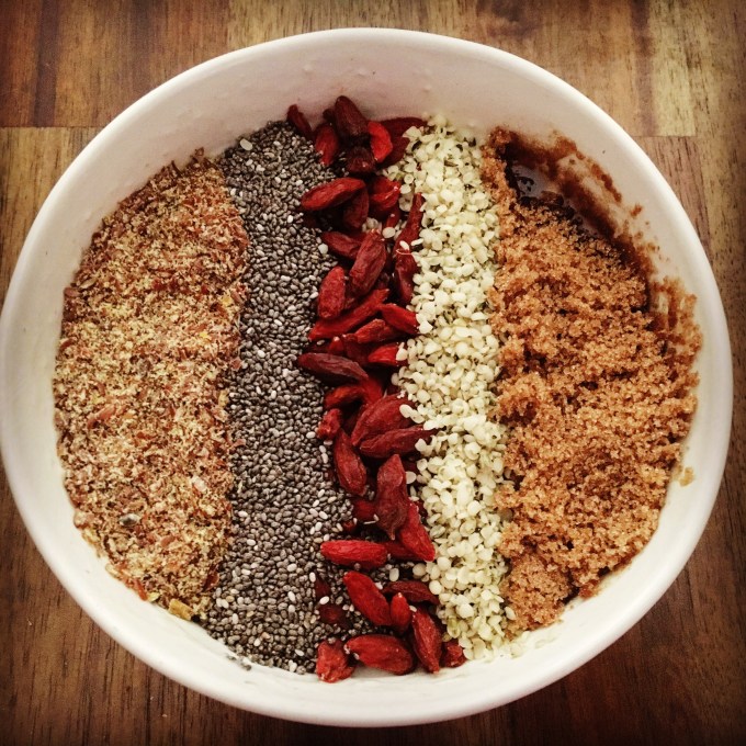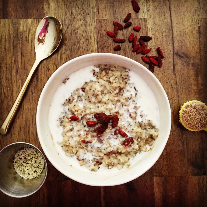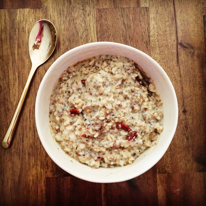 So I figured I could add a small amount of butter, brown sugar and half-and-half into regular old morning oatmeal and then healthify it with superfoods to make a protein and fiber packed steaming morning bowl of cooked oats.