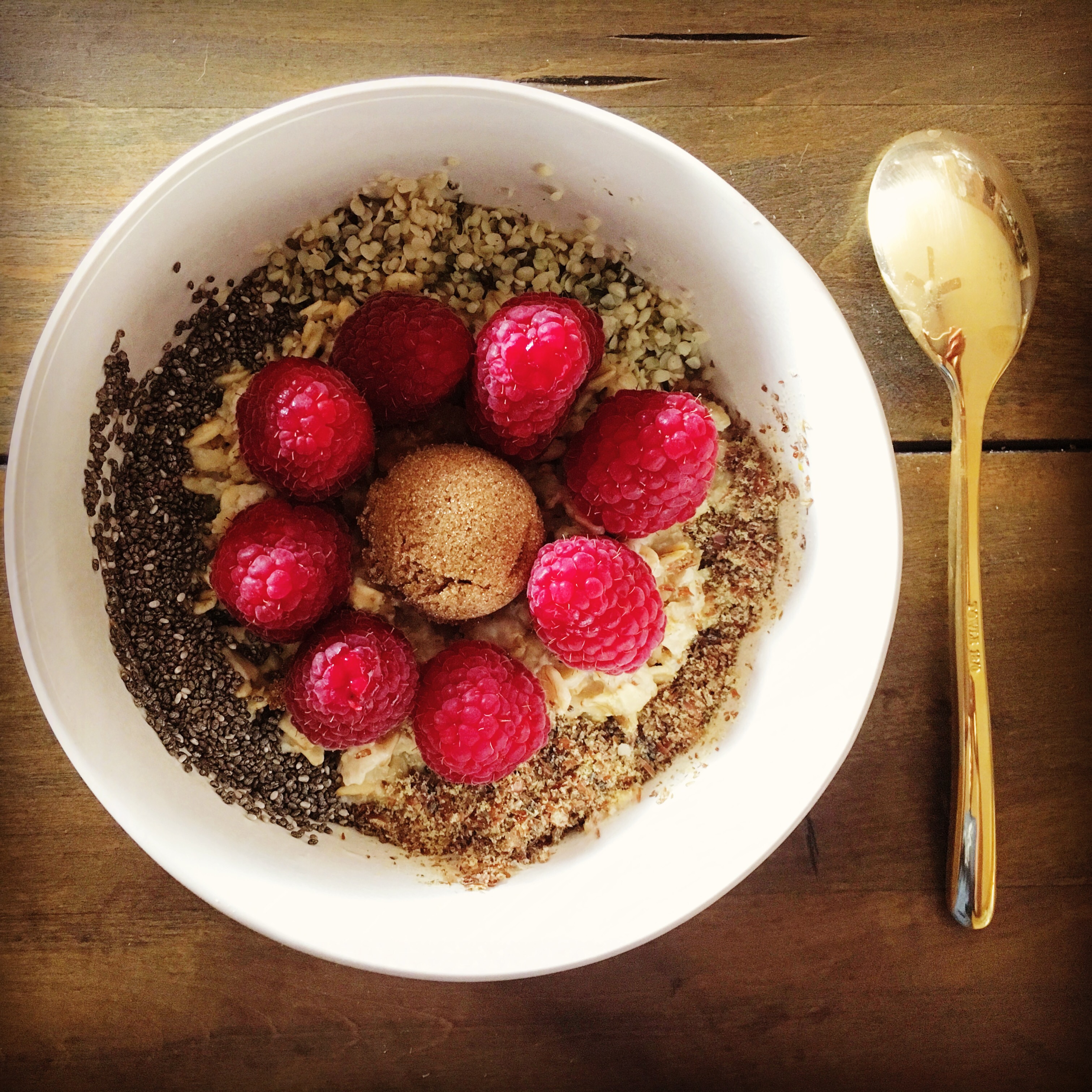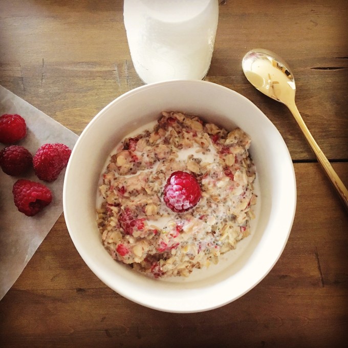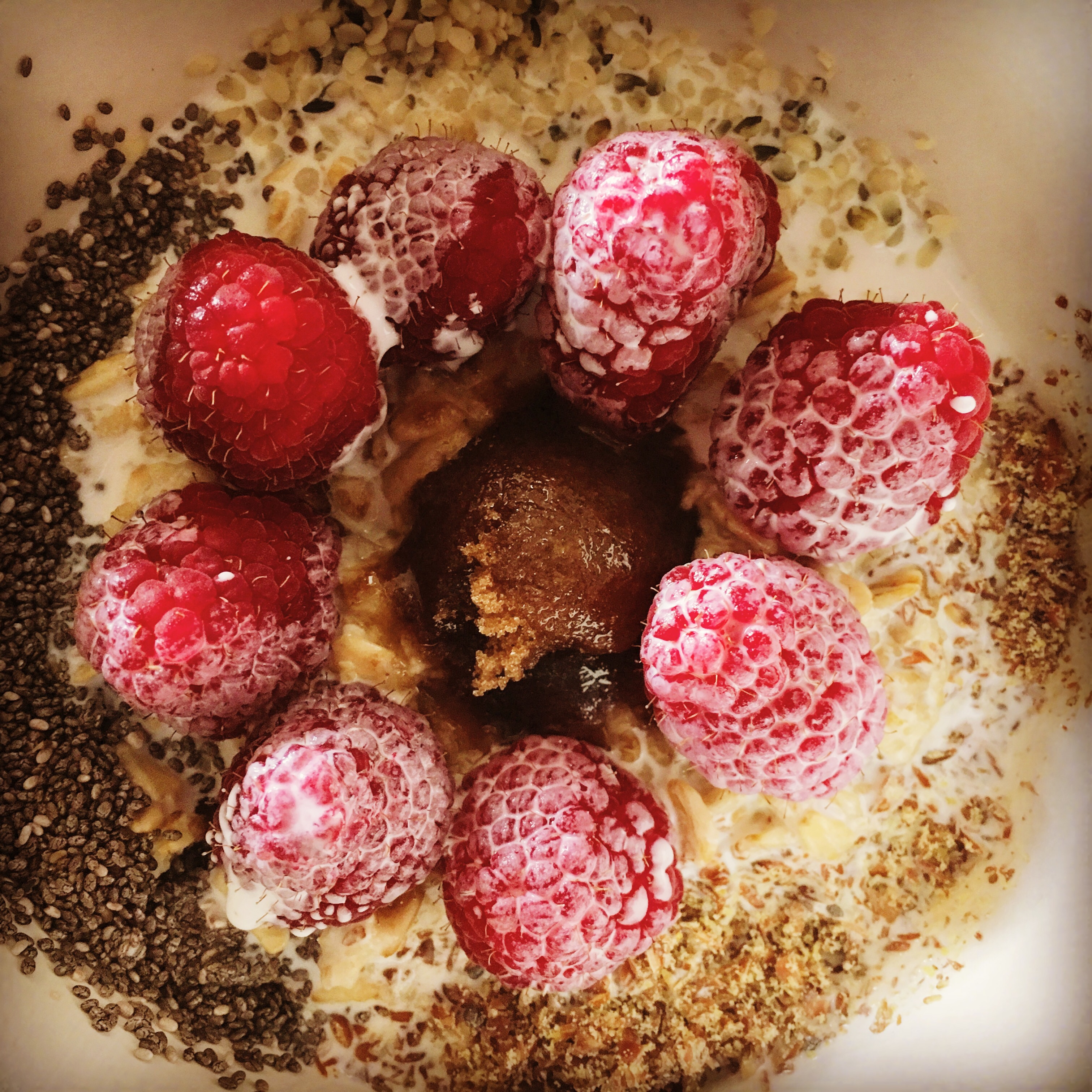- Once ready to eat, heat in the microwave for 60 to 90 seconds. Add brown sugar, raspberries and seeds and mix to incorporate. Mash the raspberries with you spoon if you’d like.