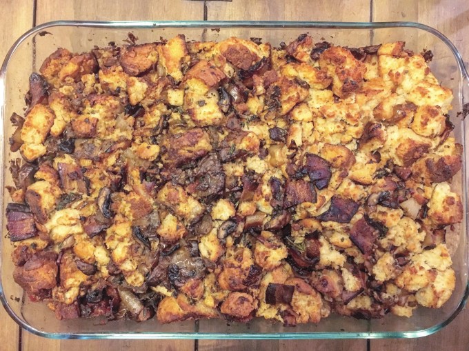 The day of I got going early with this recipe by baking the biscuits. While the turkey was in the oven, I began prepping the rest of the ingredients. This is where things went awry. I had purchased three large yellow onions for two Thanksgiving Day recipes. However, I didn’t realize that this recipe did NOT call for LARGE onions. So I’m sauteing all my vegetables (onions, celery and mushrooms) and I’m noticing that the pan is quite voluminous. I glance over at the biscuits sitting not that far away and think … huh … it appears that there are waaaaaaaaaaaaaaaaaaay more vegetables than biscuits going on here. Now I’m not a stuffing/dressing expert, but I would think that you want your “bread” to be the start of the stuffing/dressing show.