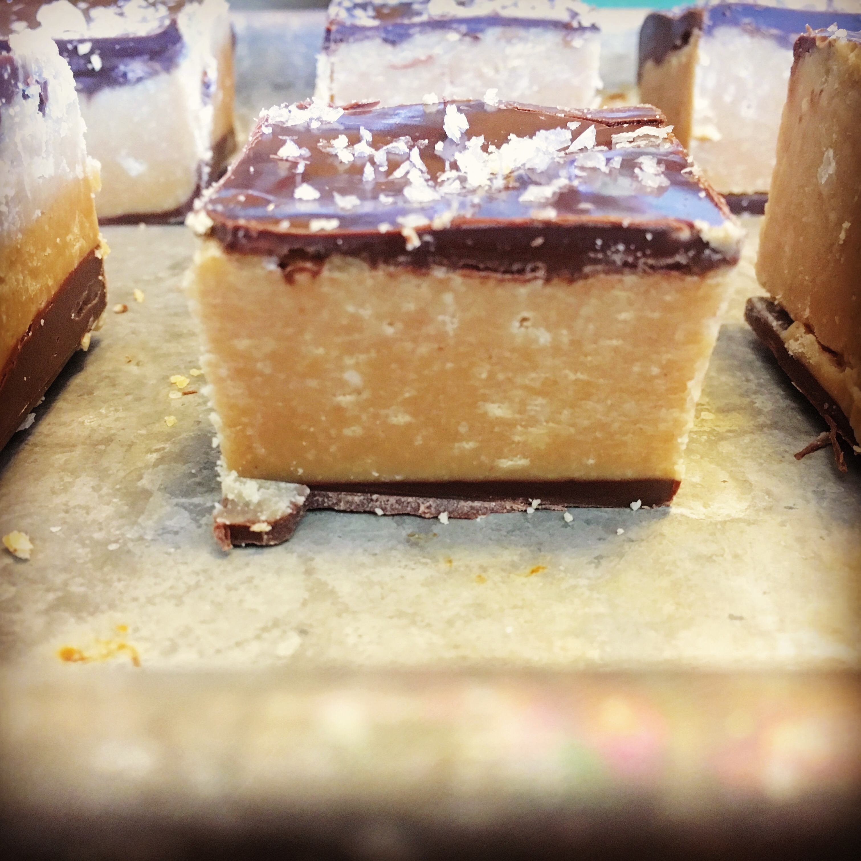 I settled on the recipe found at Brown Eyed Baker’s website. When describing her recipe, she talks about how the fudge reminds her of the inside of a Peanut Butter Buckeye treat, which is a Christmas staple in the Midwest (and maybe other places – as far as I’m concerned it should be a Christmas staple anywhere). Anyway, I got to thinking about Buckeye treats (or peanut butter balls, which is what my family makes) and how time consuming they are. So I thought … why not make an easier version of peanut butter balls? Why not make the bar version. So I poured some chocolate down on the bottom of my pan before pouring in the peanut butter fudge filling and then topped the fudge filling with more chocolate and some flakey sea salt and voila. A star was born.