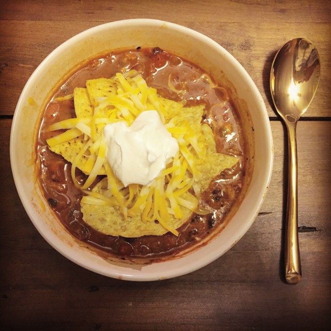 - Simmer for one hour. Season with salt and pepper, if desired. Serve with cheese, sour cream, and tortilla chips.