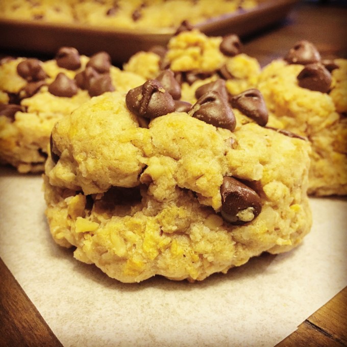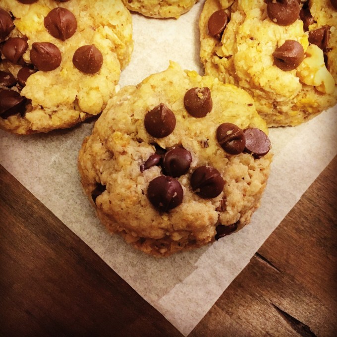 These cookies are not household in name (most people have never heard of this cookie when I bring it up), but they should be. These cookies are seriously rockstar. They rival Monster Cookies, which I usually ask my mom to make every year when she’s making Christmas cookies (especially if she’s visiting me or I’m visiting her.) Take your standard chocolate chip cookie recipe, add oats, coconut and cornflakes and that is what makes a Farm Cookie. Not sure the title is particularly representative of the cookie but it is what it is. Perhaps someone on a farm created the recipe.