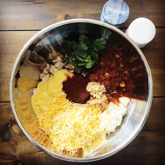I love this recipe because it’s super fast. You literally mix all the ingredients together and slap the mixture into tortillas, top with more mixture, cheese and bake for 40 minutes. It’s fast and easy and looks impressive!