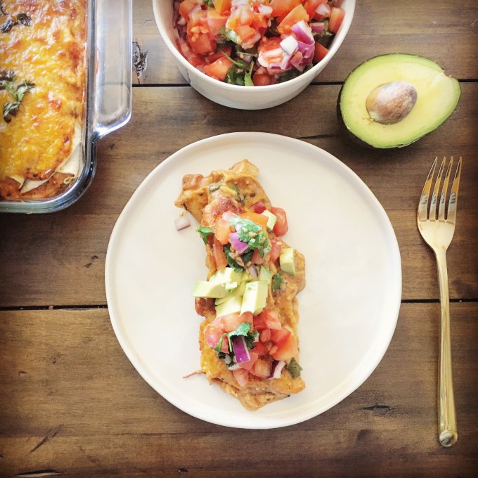 I changed the recipe slightly from when I last made this dish six years ago. I used low-carb tortillas because they weren’t egregiously priced at the grocery store this morning and I love how much fiber they contain. I swear they don’t taste any different than regular flour tortillas. I added a bit more chicken and a bit more salsa, plus added some garlic and cilantro to the mixture. I used eight tortillas instead of the recommended six and topped the dish with some fresh cilantro before cooking. After I pulled the dish out of the oven I topped my enchilada with pico de gallo and cubed avocado.