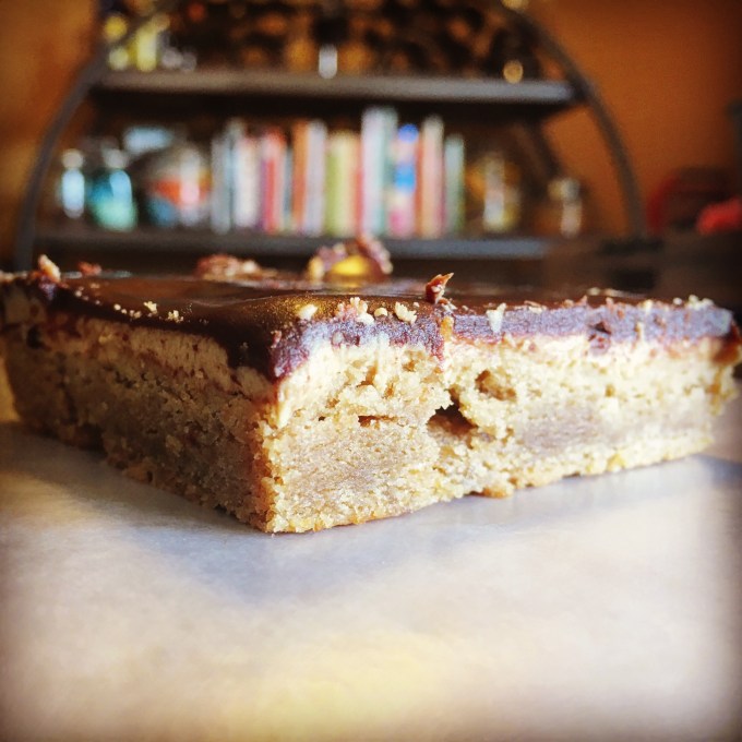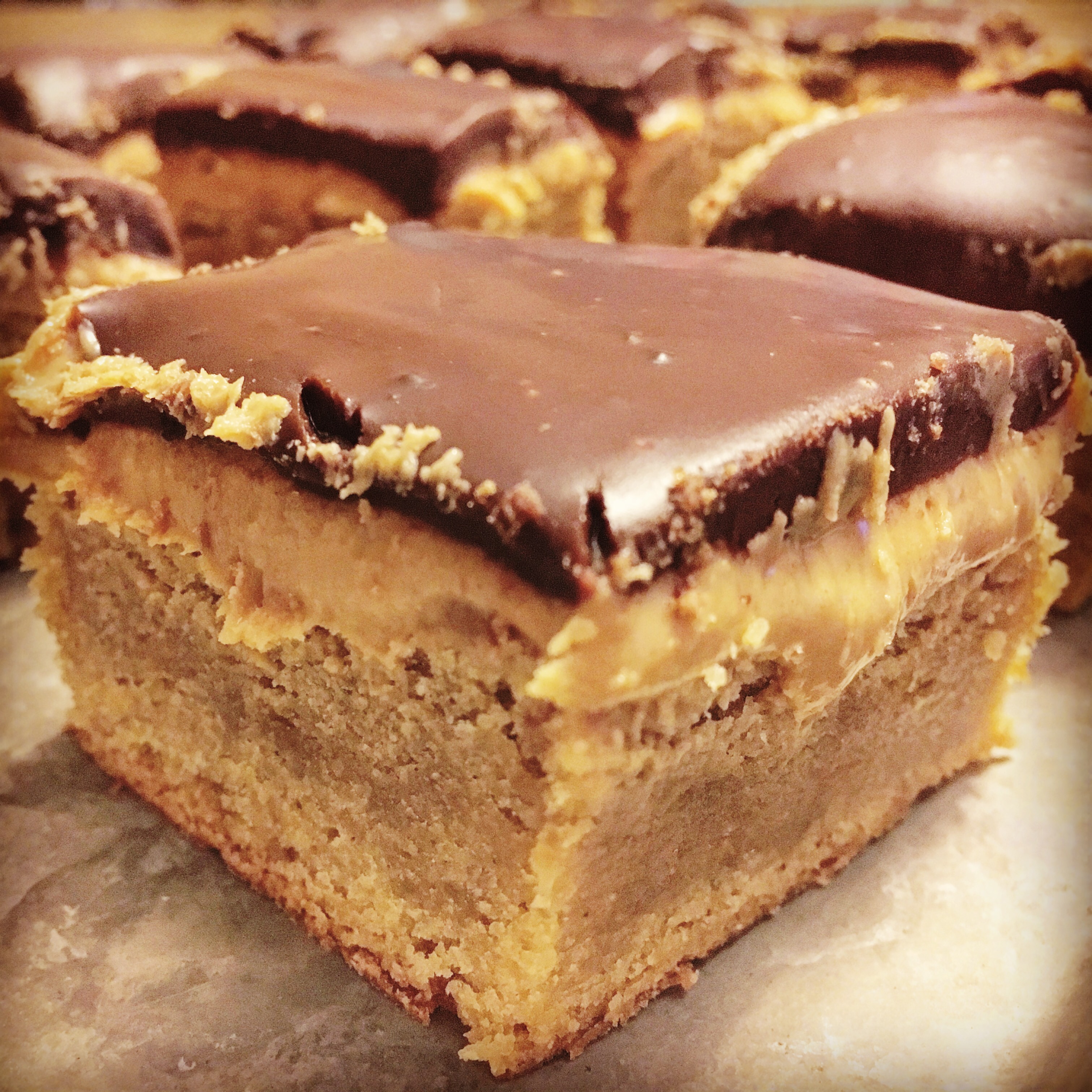 The trick with these bars is that you need to make them a day before you plan to serve them. Just as the directions say. I’m not sure why but the magic happens when you cut them and let them sit in the refrigerator overnight. The peanut butter filling seeps into the cookie-like base making the base super moist. I cut them in large squares and brought them to work on a Friday. My boss ate five of them that day!
