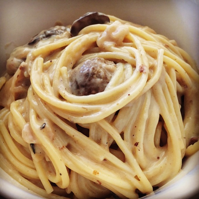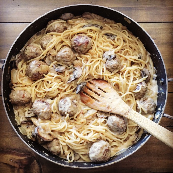 A few weeks ago I made Bacon Stroganoff to use up some really good, expensive bacon my dad had purchased. I’d seen recipes for meatball stroganoff on Pinterest but I wanted my recipe to be specific to the combination of spaghetti and meatballs as I was using some frozen meatballs my mom had made on one of her recent visits to California. If you don’t have any meatballs lying around in your freezer, try Trader Joe’s. They have a decent turkey meatball option.