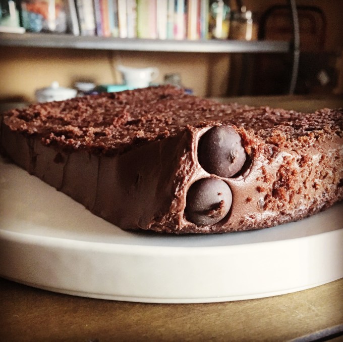 I once made this cake as a surprise for her birthday — it may have been her 50th. The real surprise was that I had put wax paper down on the bottom of the pan before baking so the cake wouldn’t stick to the bottom of the pan and I forgot to take it off. When I went to cut through the cake, I had an incredibly hard time even though I was using a large serrated knife. I couldn’t figure out why until we began digging in and hit wax paper. Luckily the wax paper was easy enough to pull out between the layers. But that was a real whoops-a-daisy!