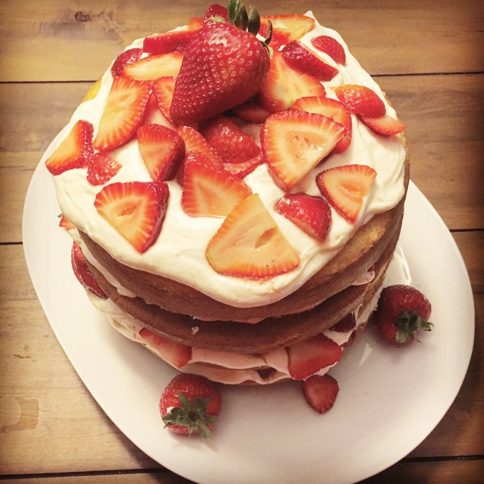 I have a coworker who loves to bake as much as I do. Maybe more. We talk shop (baking shop) frequently. Like what kind of flour works best in biscuits. Or how macarons turn out one out of every three times you make them. So when I found out she was turning 30 (such a young’n!), I volunteered to make her a cake. It was a great excuse to try a new recipe. So I asked her what type of cake she wanted and she started out talking about a white cake with some sort of fruity filling. I’m not sure why but my mind immediately went to strawberry short cake turned into a layer cake. I found a great looking recipe at Go Bold with Butter. So I sent the recipe to the birthday girl for approval. I got a thumbs up and a suggestion for a sturdy whipped cream if I was looking for something that would hold up on the cake. Considering that the cake probably had to last a few hours before we could dig into it, I decided the sturdy whipped cream was the perfect option. Thus, a star was born.