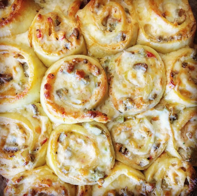 - Starting with one edge of the crust, gently roll into a log (the long way). Using a sharp knife, cut into even slices. I got about 16 huge pizza rolls that got smoothed when I cut them. So I decided to individually re-roll each of the rolls. This ensured the rolls were more round instead of oblong and the ingredients were held tight against the crust.