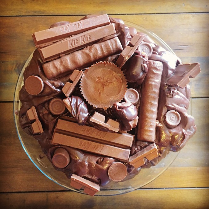 I had intended to make the Blackout ChocolateCake by Pinch of Yum exactly as is, until Kira presented me with her cake monstrosity. So I used the blackout cake recipe for the cake and frosting and created my own monstrosity for toppings. My (slightly tweaked) version of the blackout cake is below.