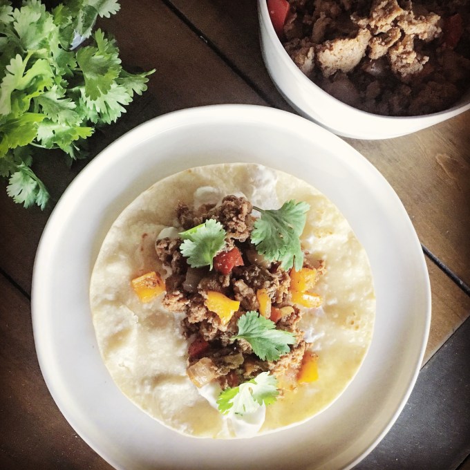 I love tacos. Earlier this week I made ground turkey tacos that came pre-seasoned. They were good. Decent. Solid. These tacos rock. They crush the preseasoned ground turkey tacos I have been eating all week. These tacos are a bit spicy but the flavor is so good I wouldn’t weigh it down with a lot of taco toppings. To me the sour cream and cilantro were perfect accompaniments to the flavorful meat. I loved the addition of the bell peppers so much that I’m not sure I would want to make taco meat without it ever again!