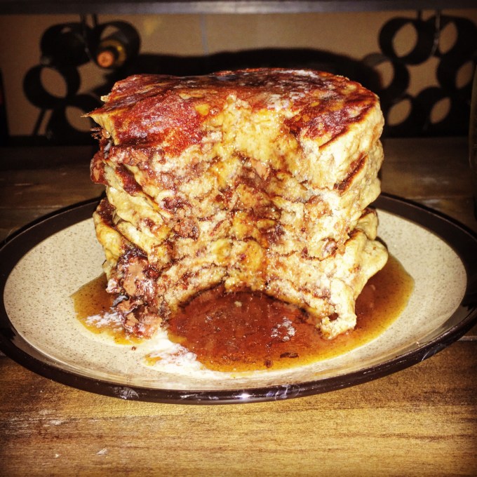 My first go-round was OK. I used two cups of multi-grain flour and the pancakes spread out a bit too much despite the fact that they batter seemed really thick. I added more flour on the second batch I put on the griddle and that solved that problem. What I didn’t like was that there wasn’t an overwhelming taste of banana. It was like hint of banana. And I forgot to add the salt so that didn’t help matters out at all. Also, I remembered why in the past I’ve never mixed chocolate straight into the pancake batter: it burns on the griddle. Normally I would add chocolate chips individually to each pancake once on the griddle and try to poke the chocolate chips down into the batter with my spatula so that the chocolate was not touching the surface and, therefore, wouldn’t burn. I was reminded why I always used that technique the first time I tried this recipe.