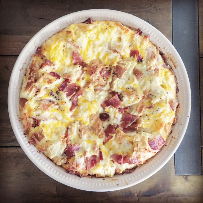 The recipe called for ham and I subbed bacon because … bacon rocks. It also called for onion rolls. I couldn’t find onion rolls at the grocery store and instead went with some buttery dense rolls that I found in the bakery of my local grocery store. The recipe said you do not need to make this recipe the night before baking but I did anyway to save time in the morning.
