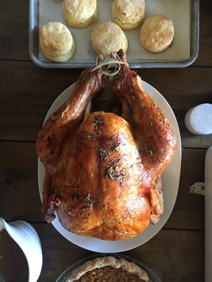 In sifting through my “Thanksgiving” recipe cache I keep, I chose this recipe for turkey because it was so simple. I’ve made an herb-roasted turkey. I’ve done a dry-brined kosher turkey. I made roast turkey stuffed with herbs and veggies and brined beforehand. I overcooked some turkey legs in a crock pot one year. I baked a mile-high a ground-turkey “Shepherd’s Pie” once. And this year I wanted to go super simple and classic. Just a basic roast turkey which is what you see here.
