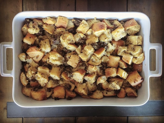 This year’s recipe is from Penzey’s magazine and sent to me by my grandma. It’s classic really. Sour dough bread, sausage, herbs, onion and celery.
