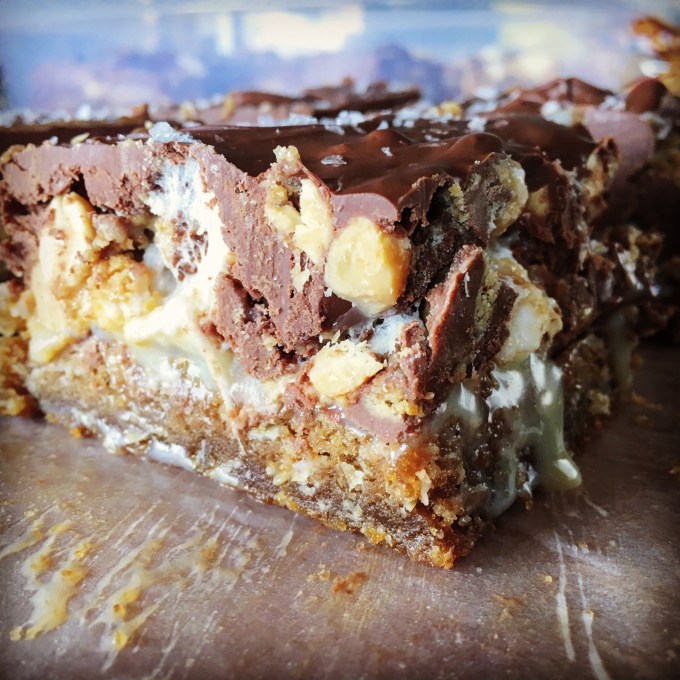 So let’s get on with it already. Where did my inspiration for this bar come from, you might wonder. Well I originally wanted to make a peanut butter version of seven layer bars. So I bought some Reese’s Peanut Butter Cup, Reese’s Pieces and dry-roasted peanuts with every intention of making a seven-layer bar.