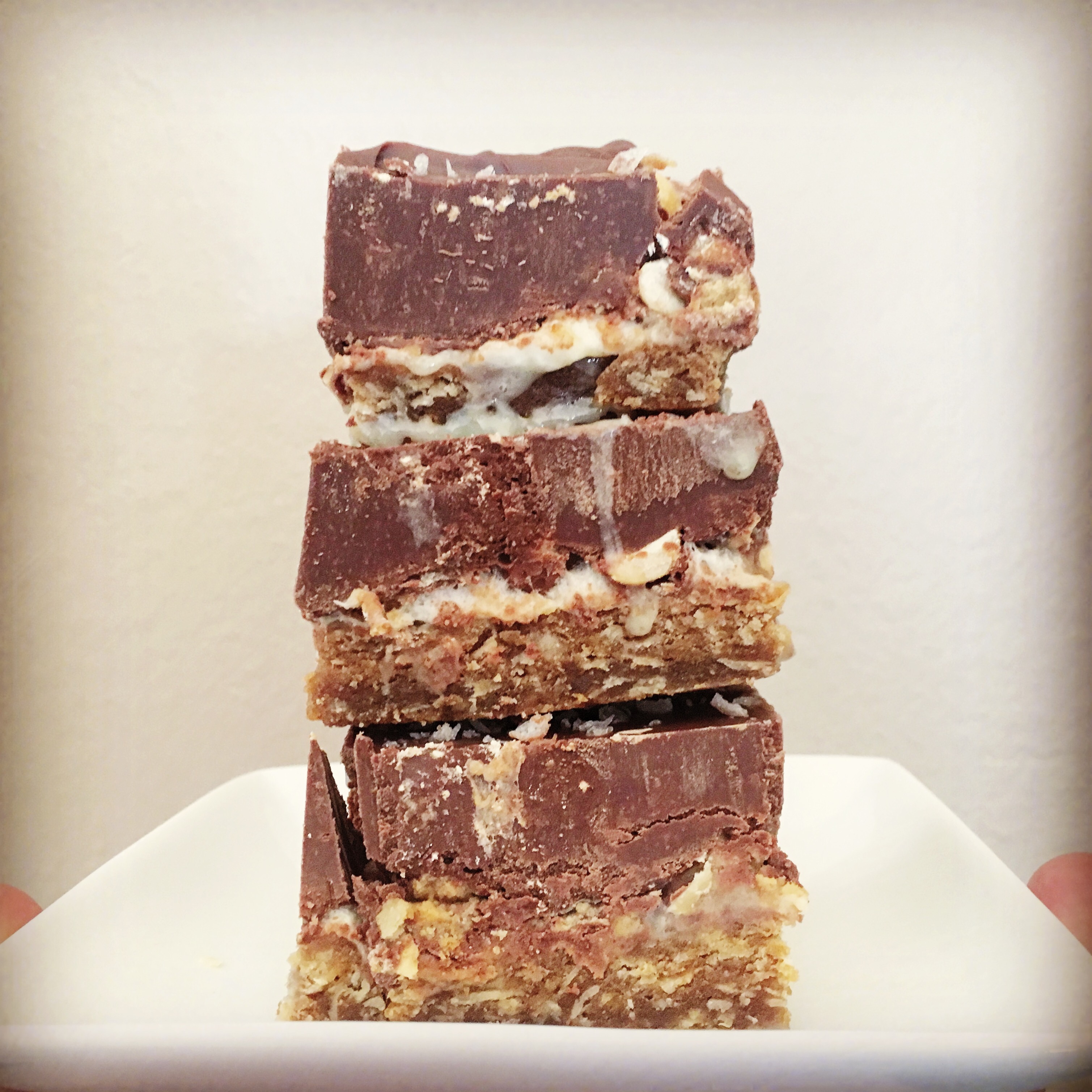 So there you have it. I could no longer call the bar “seven-layer” and decided to use the term “gooey” because the bars were going to be gooey in the middle what with the condensed milk and marshmallows.
