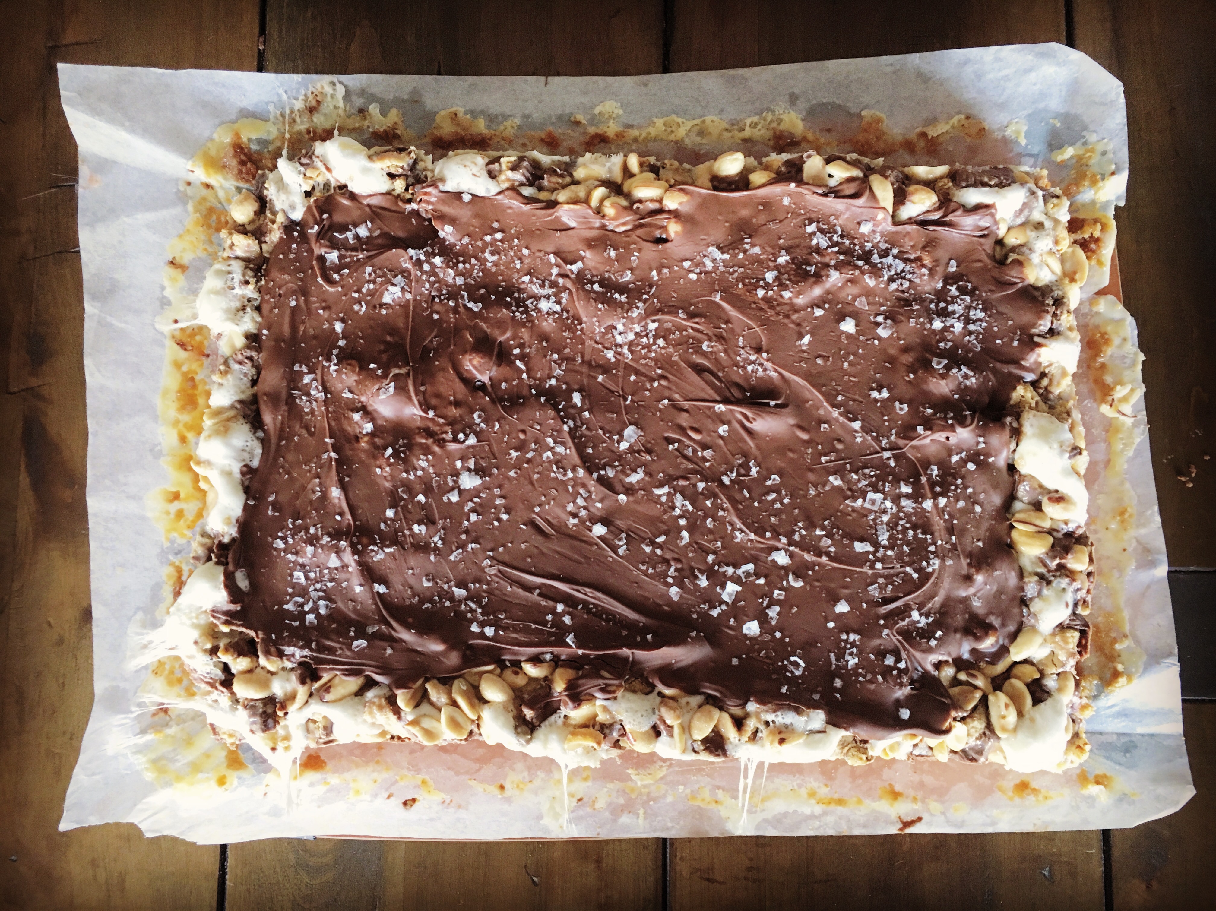 I could live with that, I decided. It’s not like I can’t make a seven-layer bar some other time. As I was baking the base for this bar, the best peanut butter cookie dough I’ve ever eaten, I wondered how marshmallows would taste inside the bar. I figured they would taste pretty darn good and was reminded of a “payday” bar my friend made a few months ago that involved marshmallow, peanuts and peanut butter, probably amongst other things.