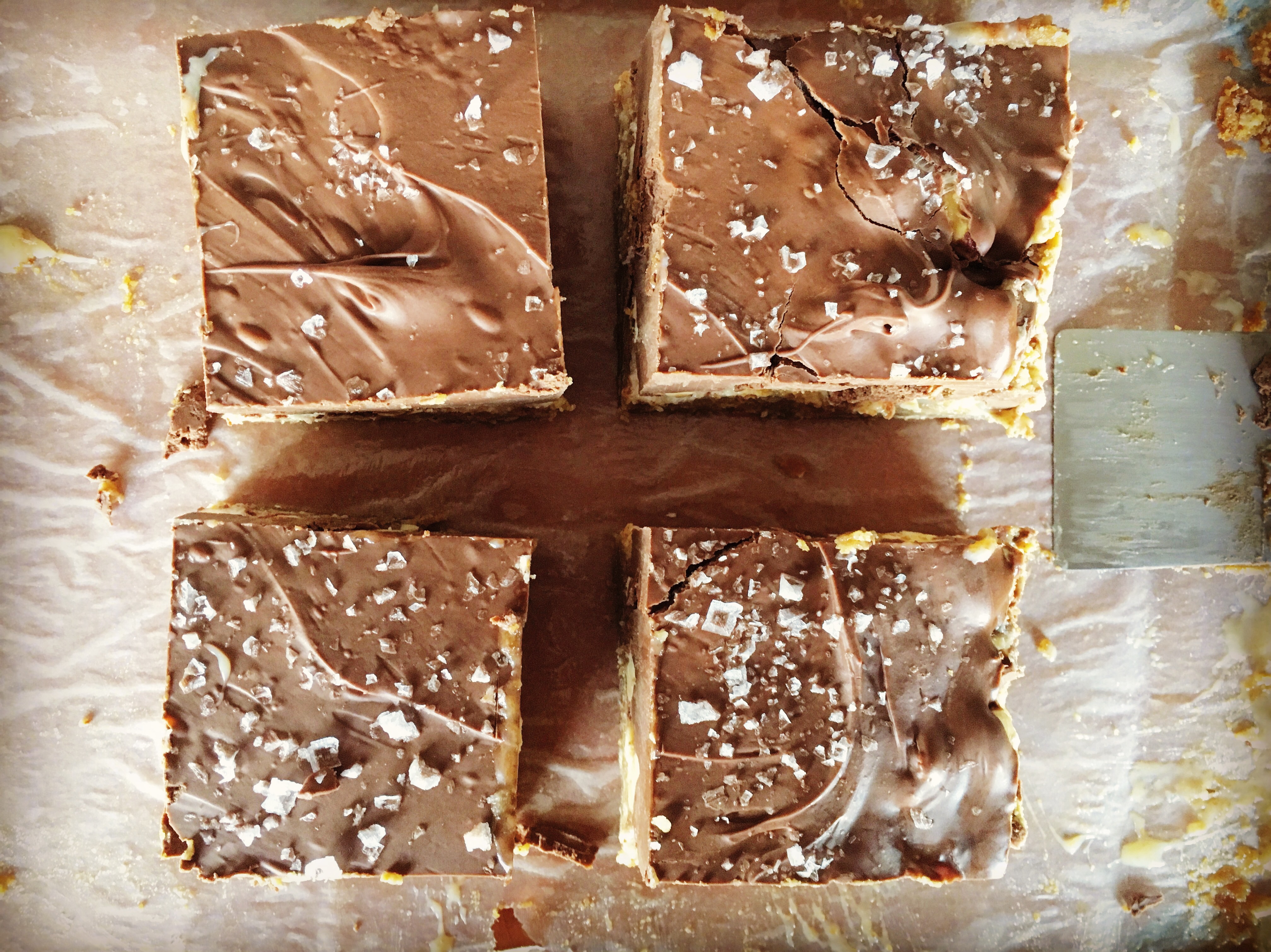 - In a medium sauce pan, melt butterscotch chips and chocolate chips over low heat and stir until completely smooth. Pour over cooled bars and spread evenly across the top. If desired, sprinkle with flakey sea salt. Let cool completely before cutting into bars.
