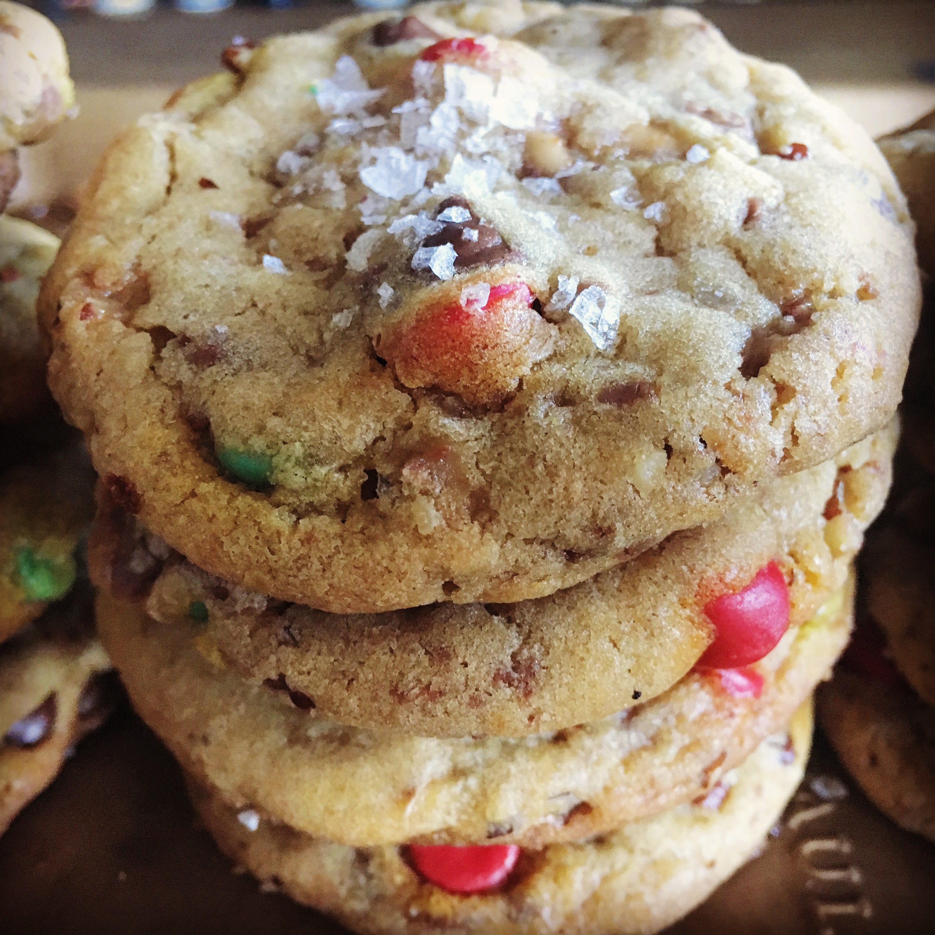 That being said, I was very pleased with this cookie. And so were all my coworkers. You can find red and green chocolate chip cookies made by Nestle around the holidays, but red and green M&Ms would work well too.