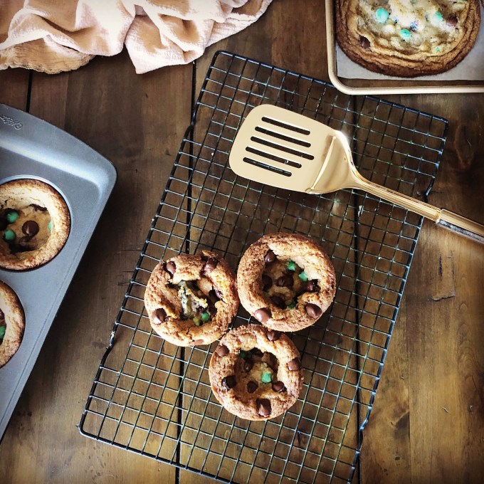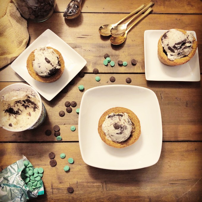 These cookie cups go perfect with Ben and Jerry’s Mint Oreo ice cream. Incidentally, the ice cream is what inspired me to make this cookie turned dessert.