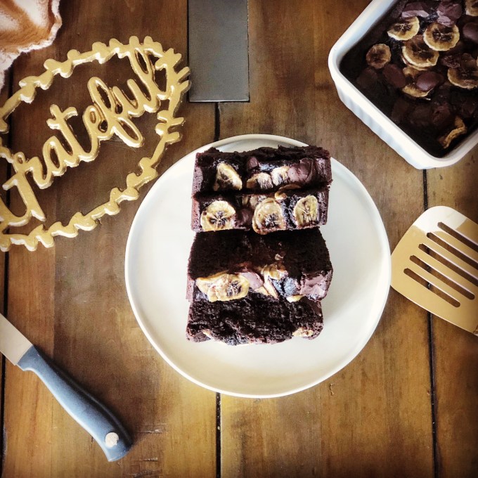 - Peel and slice the banana and sprinkle across the top of the batter. Sprinkle with additional chocolate chunks, if desired.