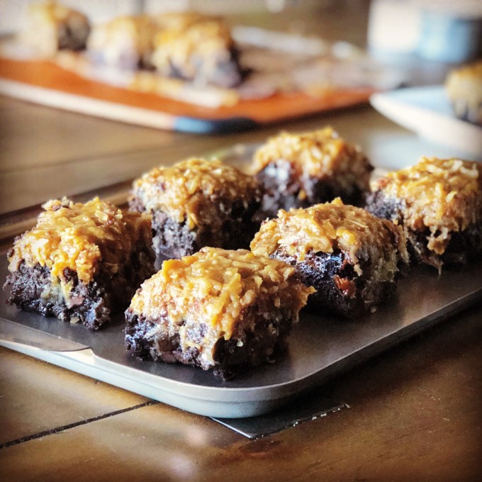 - Add the butter and warm over medium-high heat, stirring constantly until the mixture thickens slightly, 5 to 10 minutes. Remove from the heat and stir in the vanilla, salt, coconut and pecans. Spread on top of cooled brownies and stick in the fridge to cool completely. Remove the brownies from the fridge once they have cooled completely, lift the entire sheet of brownies out of the pan by the edges of the parchment paper and cut immediately.