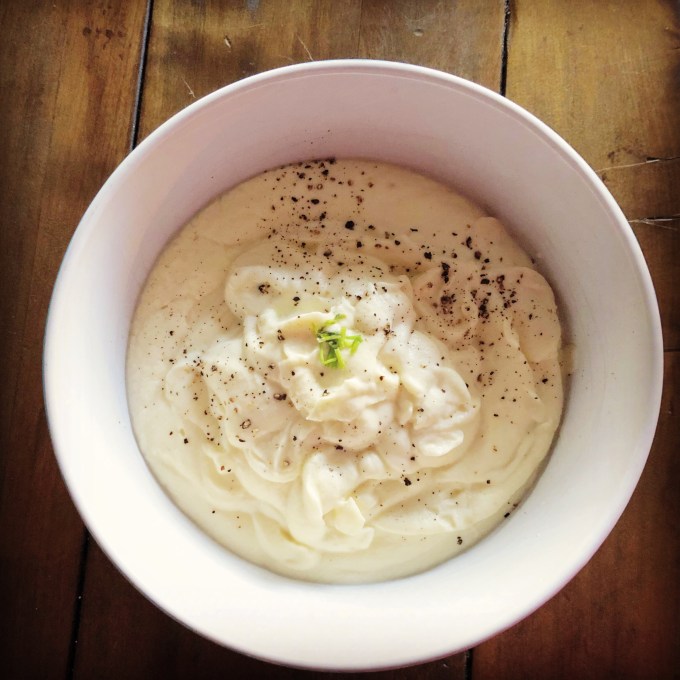 Ever since I made a paleo Shepherd’s pie a few months ago I have been wanting to make myself some cauliflower mash. For the Shepherd’s pie I had made a cauliflower puree that I mixed with mashed white sweet potato. I remember licking the cauliflower puree out of my Vitamix thinking that was disappointed I had to mix it with sweet potato. It was so good on it’s own. I wanted to drink it. And it didn’t even taste like cauliflower to me. You know what I mean. That skunky taste. There was none of it. Anyway, I bought myself a head of cauliflower the other day from Trader Joe’s with the intention of making some cauliflower mash.